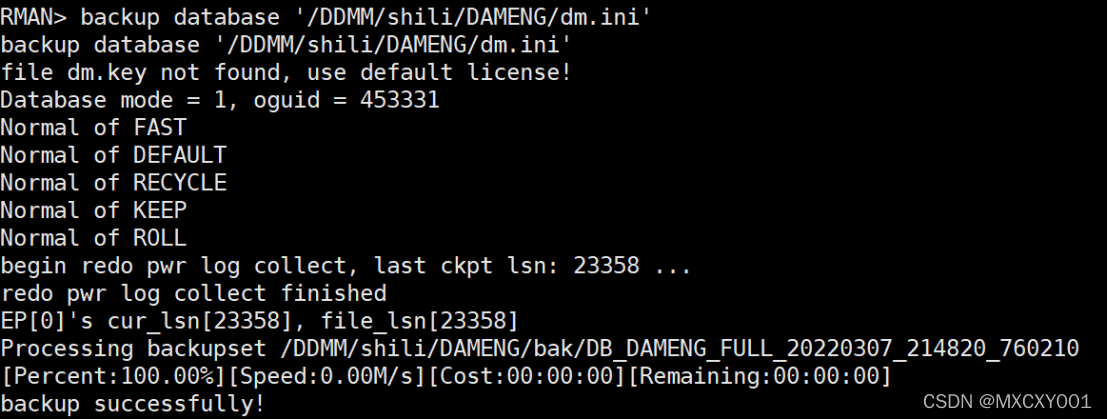backup database '/DDMM/shili/DAMENG/dm.ini'