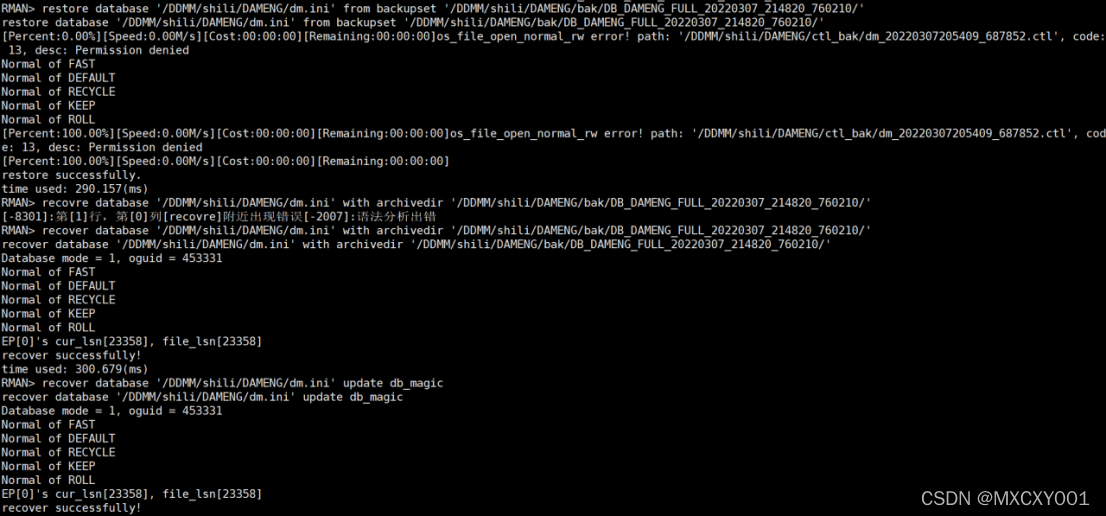 recovre database '/DDMM/shili/DAMENG/dm.ini' with archivedir '/DDMM/shili/DAMENG/bak/DB_DAMENG_FULL_20220307_214820_760210/'