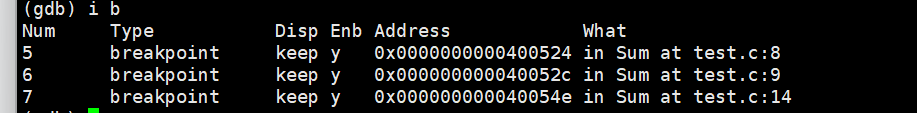 break/b 函数名 在函数开头设置断点 break main info break/b 查看当前所有断点的信息 info break