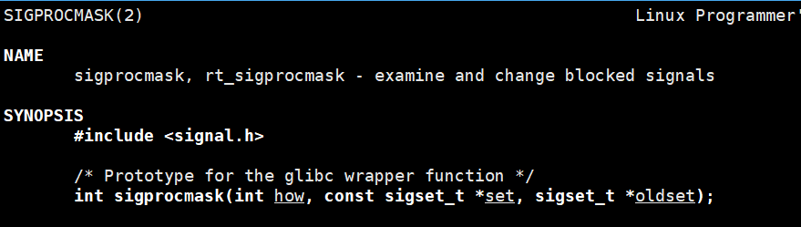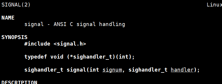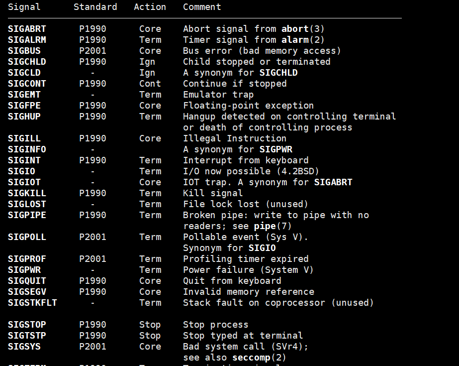 编号34以上都是实时信号(类比实时操作系统、实时进程),本文只讨论34以下的信号。这些信号在什么情况下产生,默认处理动作是什么,在signal(7)里都有详细说明:man 7 signal