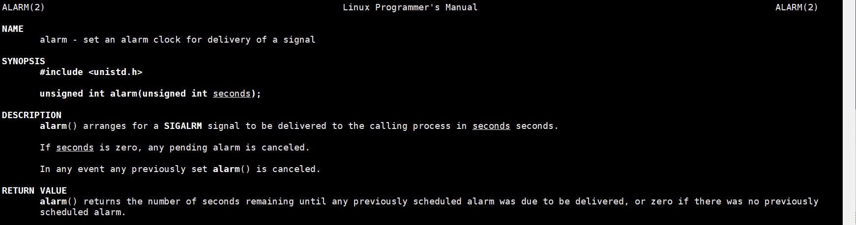 调用alarm函数可以设定一个闹钟,告诉内核在seconds 秒后给当前进程发送SIGALRM信号,该信号默认动作是终止当前进程。