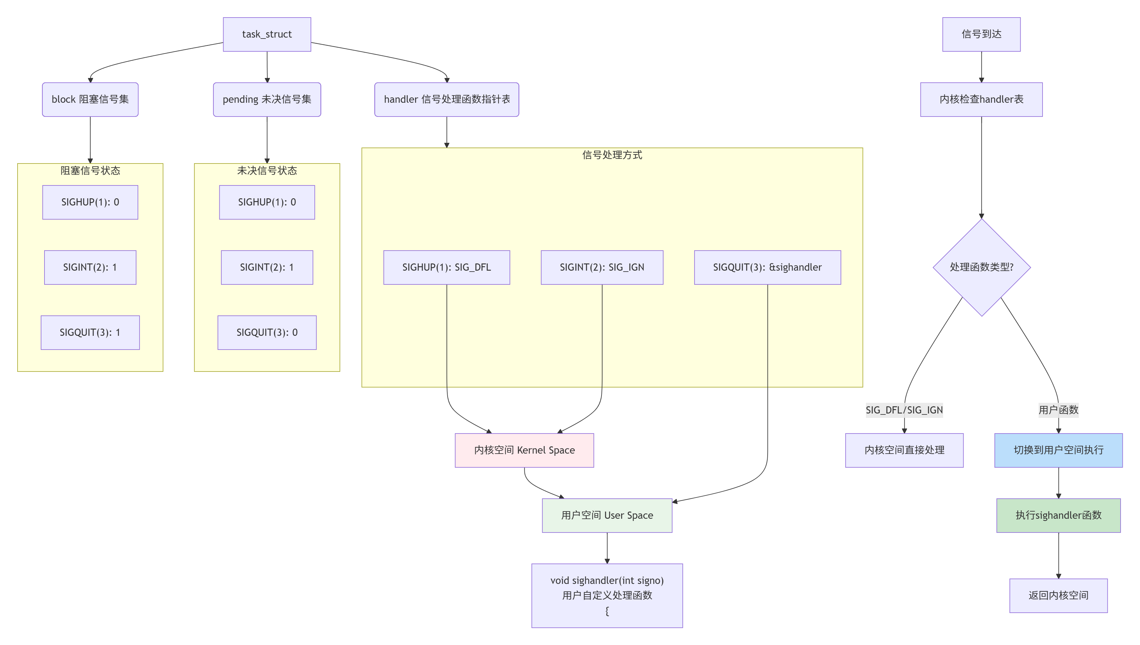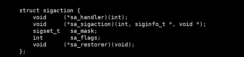 signum是指定信号的编号。若act指针非空,则根据act修改该信号的处理动作。若oldact指针非空,则通过oact传出该信号原来的处理动作。act和oact指向sigaction结构体: