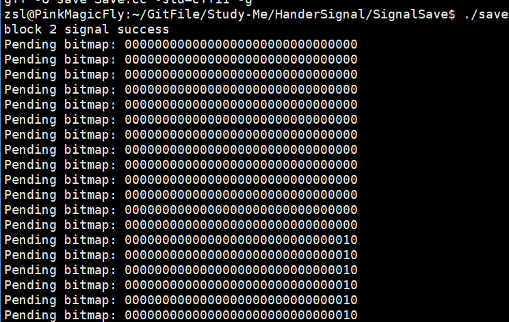 #include<iostream> #include<signal.h> #include<unistd.h> using namespace std; void Print(sigset_t &pending){ cout<<"current process pending: "; for(int signo=31;signo>=1;signo--){ if(sigismember(&pending,signo))cout<<"1"; else cout<<"0"; } cout<<endl; } void handler(int signo){ cout<<"signal :"<<signo<<endl; //测试当前信号在处理的时候,同样的信号不会被递归式递达而是被屏蔽,留在pending表里。 sigset_t pending; sigemptyset(&pending); int cnt=0; while(true){ sigpending(&pending); Print(pending); sleep(1); //防止死循环,自动kill cnt++; if(cnt==3){ cout<<"send 3 signal, "; raise(3); } if(cnt==5){ cout<<"send 4 signal, "; raise(4); } if(cnt==7){ cout<<"send 5 signal, "; raise(5); } if(cnt==10)raise(9); } } int main(){ struct sigaction act,oact; act.sa_handler=handler; act.sa_flags=0; sigemptyset(&act.sa_mask); sigaddset(&act.sa_mask,3); sigaddset(&act.sa_mask,4); sigaddset(&act.sa_mask,5); sigaction(2,&act,&oact); while(true)sleep(1); return 0; }