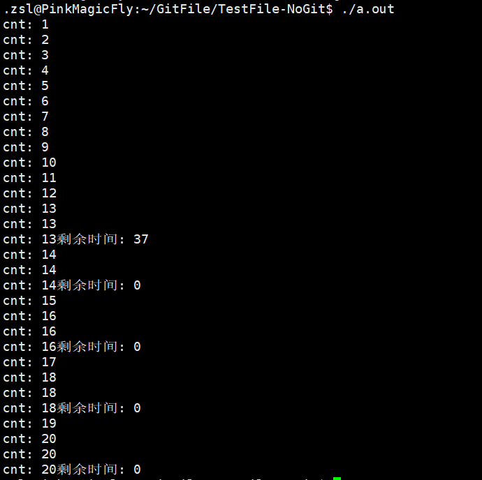 #include <iostream> #include <unistd.h> #include <signal.h> #include<sys/types.h> #include<cerrno> #include<cstring> using namespace std; int main(){ alarm(1); int cnt=0; while(true){ cout<<"cnt:" <<++cnt<<endl; } return 0; }最后结果是229667,22万左右。再看下面的代码