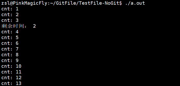 #include <iostream> #include <unistd.h> #include <signal.h> #include<sys/types.h> #include<cerrno> #include<cstring> using namespace std; int main(){ int cnt=0; alarm(5); while(true){ sleep(1); cout<<"cnt: "<<++cnt<<endl; if(cnt==3){ int n=alarm(0);//取消闹钟 cout<<"剩余时间: "<<n<<endl; } if(cnt==13)exit(0); } return 0; }
