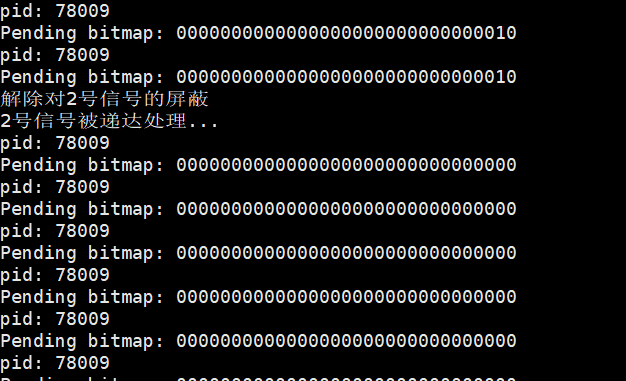 #include<iostream> #include<signal.h> #include<unistd.h> using namespace std; void Print(sigset_t &pending){ cout<<"current process pending: "; for(int signo=31;signo>=1;signo--){ if(sigismember(&pending,signo))cout<<"1"; else cout<<"0"; } cout<<endl; } void handler(int signo){ cout<<"signal :"<<signo<<endl; //测试当前信号在处理的时候,同样的信号不会被递归式递达而是被屏蔽,留在pending表里。 sigset_t pending; sigemptyset(&pending); int cnt=0; while(true){ sigpending(&pending); Print(pending); sleep(1); //防止死循环,自动kill if(++cnt==8)raise(9); } } int main(){ struct sigaction act,oact; act.sa_handler=handler; act.sa_flags=0; sigemptyset(&act.sa_mask); sigaction(2,&act,&oact); while(true)sleep(1); return 0; }