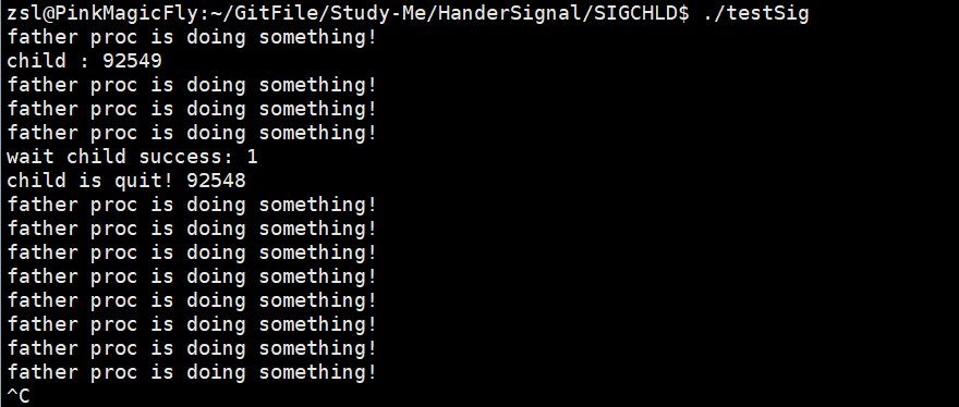 其实,子进程在终止时会给父进程发SIGCHLD信号(17号),该信号的默认处理动作是忽略,父进程可以自定义SIGCHLD信号的处理函数,这样父进程只需专心处理自己的工作,不必关心子进程了,子进程终止时会通知父进程,父进程在信号处理函数中调用wait清理子进程即可。#include<iostream> #include<signal.h> #include<unistd.h> #include<sys/wait.h> #include<sys/types.h> using namespace std; void handler(int sig){ pid_t id; //注意,不能只处理一次,因为很可能同时有多个子进程都结束了,并发送了信号 //但递达只会递达一次,所以必须用while来一次性全处理掉 while(id=waitpid(-1,nullptr,WNOHANG)>0){ cout<<"wait child success: "<<id<<endl; } cout<<"child is quit! "<<getpid()<<endl; } int main(){ signal(SIGCHLD,handler); pid_t cid; if((cid=fork())==0){ //child cout<<"child : "<<getpid()<<endl; sleep(3); exit(1); } while(1){ cout<<"father proc is doing something!"<<endl; sleep(1); } return 0; }