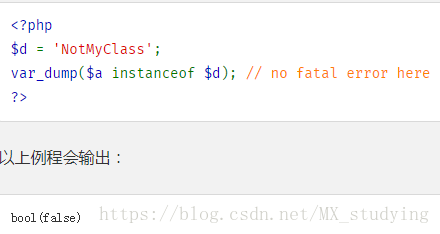 然而 instanceof 的使用还有一些陷阱必须了解。在 PHP 5.1.0 之前,如果要检查的类名称不存在,instanceof 会调用__autoload()。另外,如果该类没有被装载则会产生一个致命错误。可以通过使用动态类引用或用一个包含类名的字符串变量来避开这种问题: