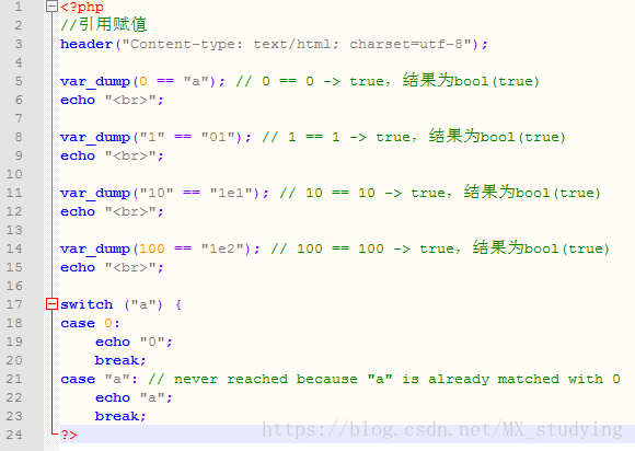 如果比较一个数字和字符串或者比较涉及到数字内容的字符串,则字符串会被转换为数值并且比较按照数值来进行。此规则也适用于 switch语句。当用 === 或 !== 进行比较时则不进行类型转换,因为此时类型和数值都要比对。