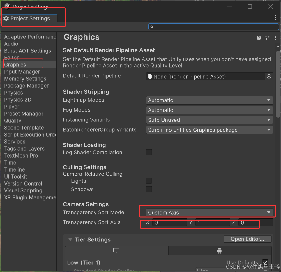 “Transparency Sort Mode” 参数其值为 “Custom Axis”。这个参数决定了 Unity 如何对透明物体进行排序以确定它们的遮挡关系。