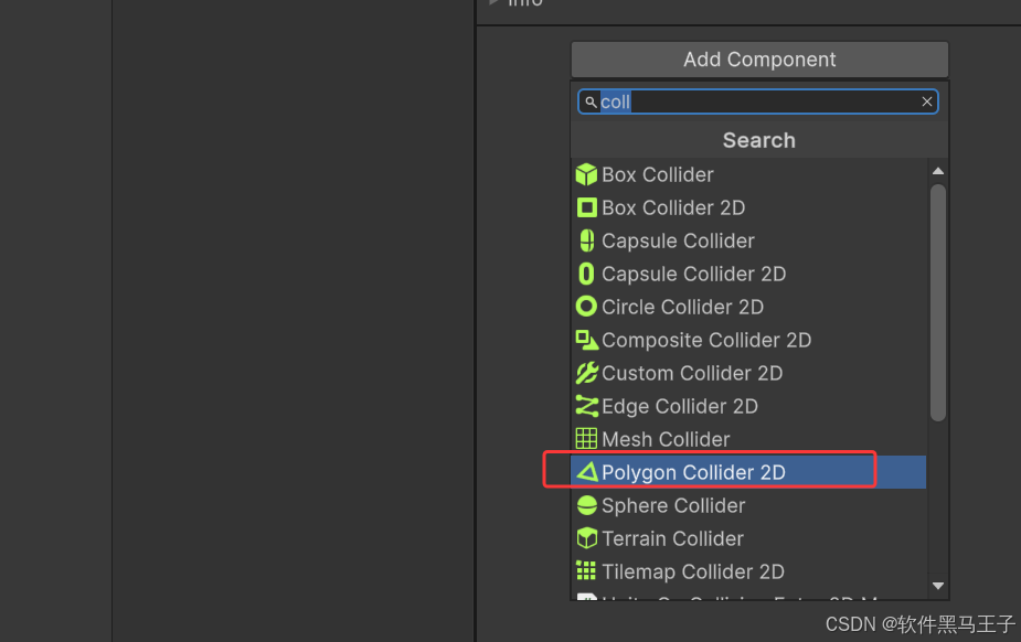 选中需要添加碰撞器的地形子对象,在 Inspector 视图中点击 “Add Component” 按钮,搜索并添加 “Polygon Collider 2D” 组件。此时,多边形碰撞器将以默认的形状(通常是一个简单的矩形)包裹住游戏对象。