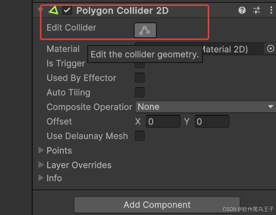 - Edit Collider:点击该按钮可以进入编辑模式,在场景视图中手动绘制或调整多边形碰撞器的顶点。