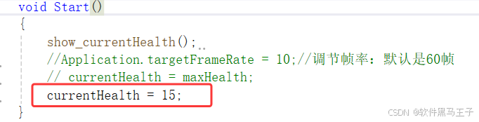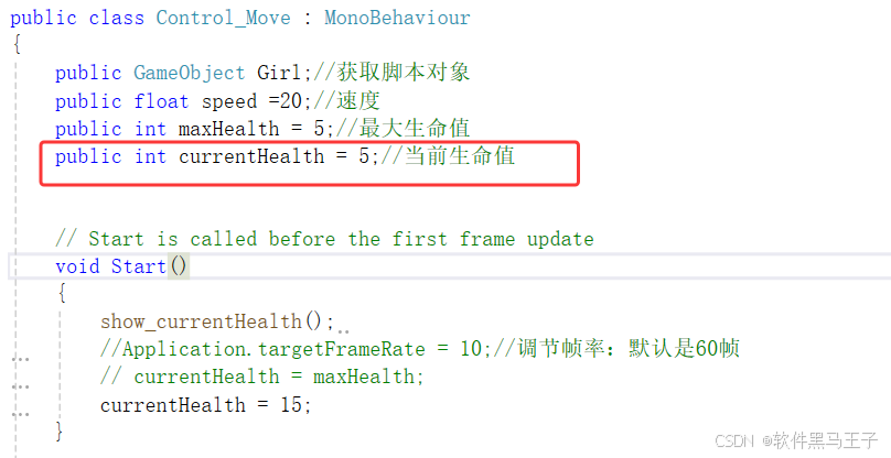 Start方法是 Unity 生命周期中的一个重要方法,它在脚本实例化之后,且在第一帧更新(即Update方法执行)之前调用。在Start方法中对变量进行赋值,会覆盖之前通过类开始处和 Inspector 面板赋予的值。示例代码如下: