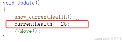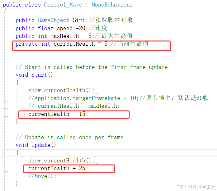 Update方法是 Unity 中最常用的方法之一,它在每帧都会被调用。如果在Update方法中对变量赋值,会在Start方法执行完后,且每帧运行到Update方法时对变量值进行修改。比如: