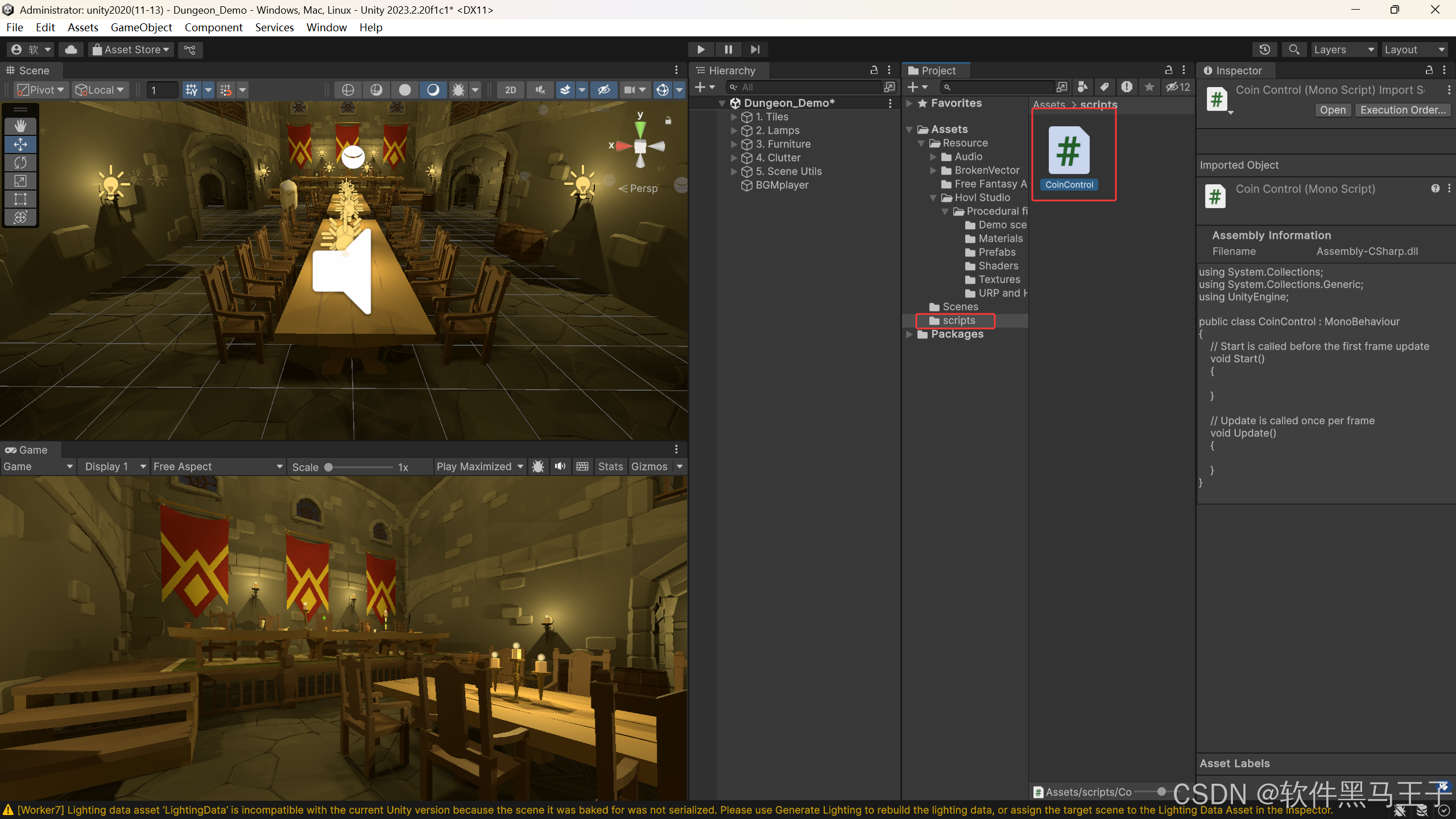 在 Project 面板中,右键点击创建 C# 脚本,命名为 “CoinControl”。该脚本将用于控制金币的生成、显示以及与玩家的交互逻辑