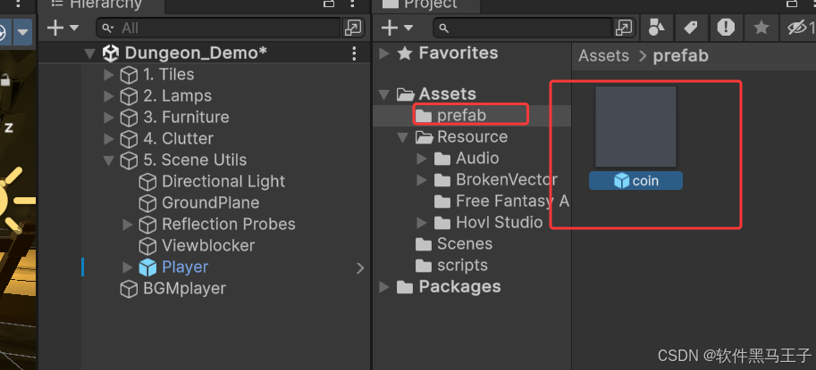 (1)在项目面板中创建金币预制件,删除层级面板中的 “Coin” 物体。