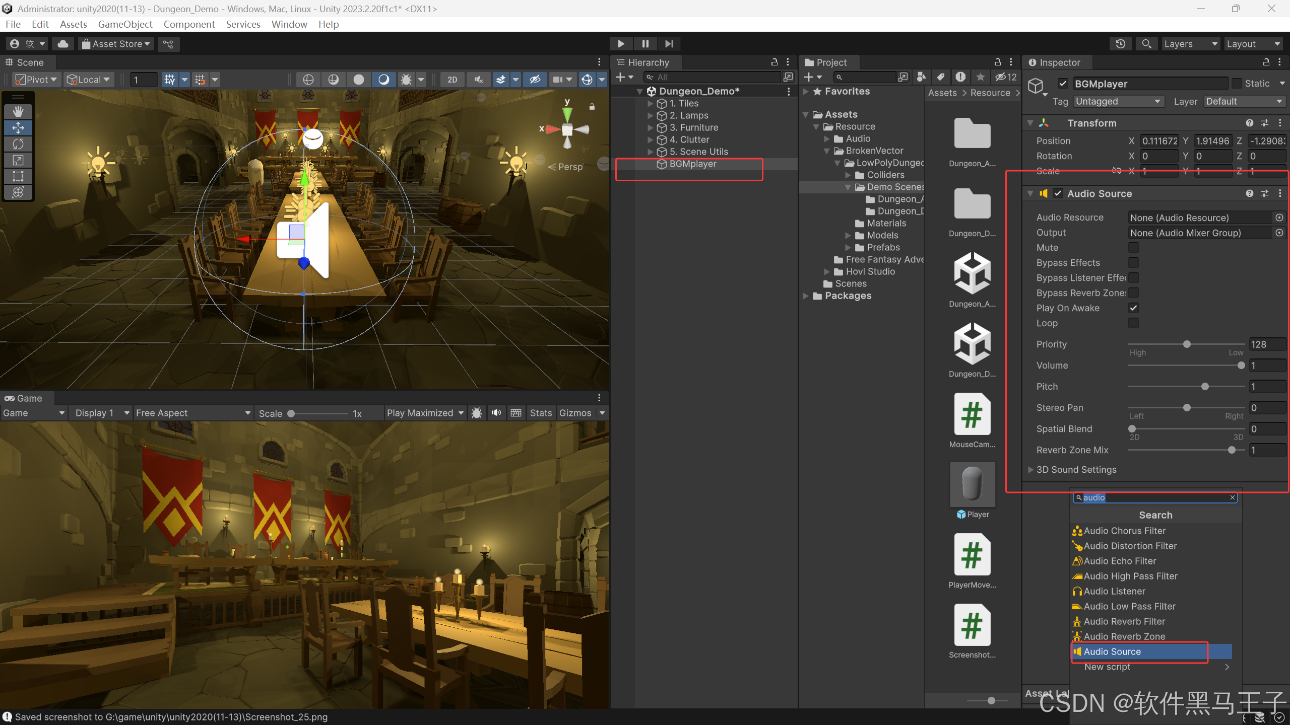 在 Hierarchy 面板中,右键点击空白处,选择 “Create Empty”,创建一个新的空物体,并将其命名为 “BGMplayer”。 选中 “BGMplayer” 物体,在 Inspector 面板中点击 “Add Component”,搜索并添加 “Audio Source” 组件。