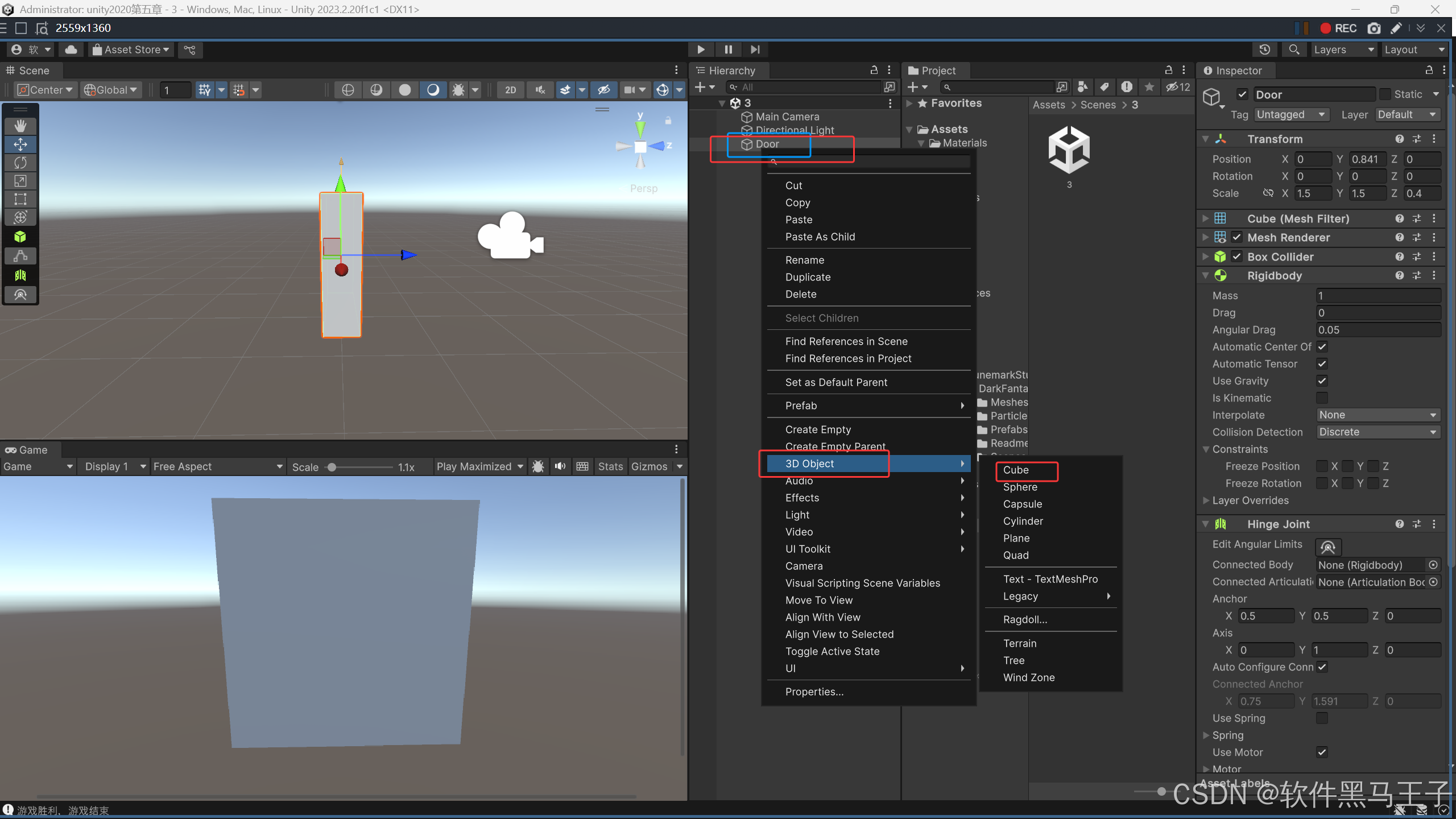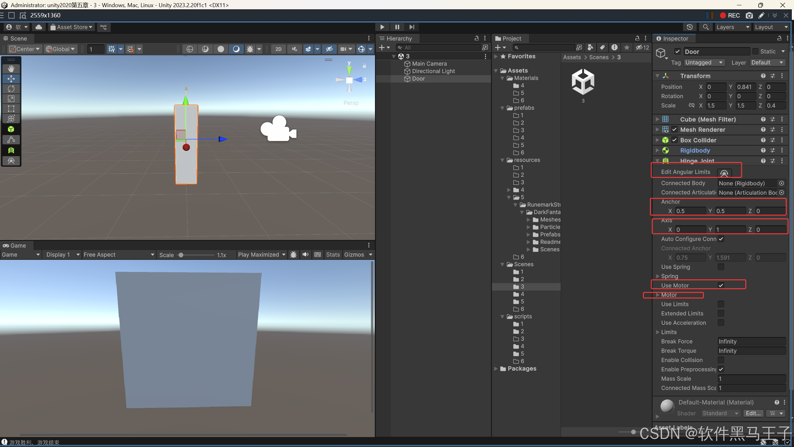 在 Unity 中,铰链关节(Hinge Joint)组件能够模拟物体围绕某个轴进行旋转的物理效果。为已经模拟成门的 cube 块添加该组件,为实现门的旋转动画奠定物理基础。