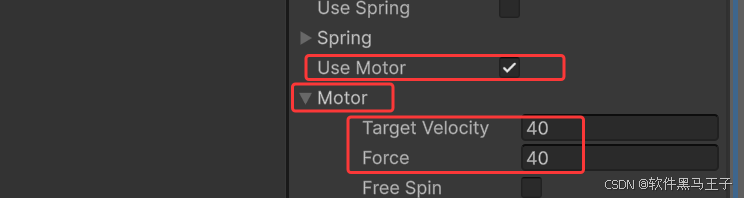 4.勾选use motor选项,设置Motor下 属性Target Velocity和Force设置为20