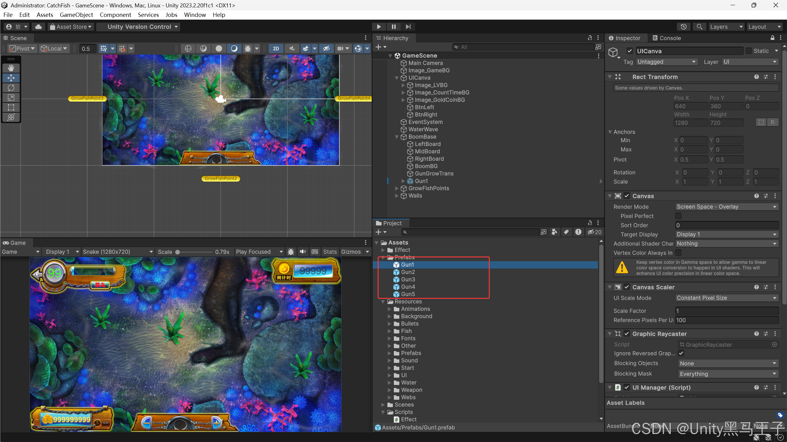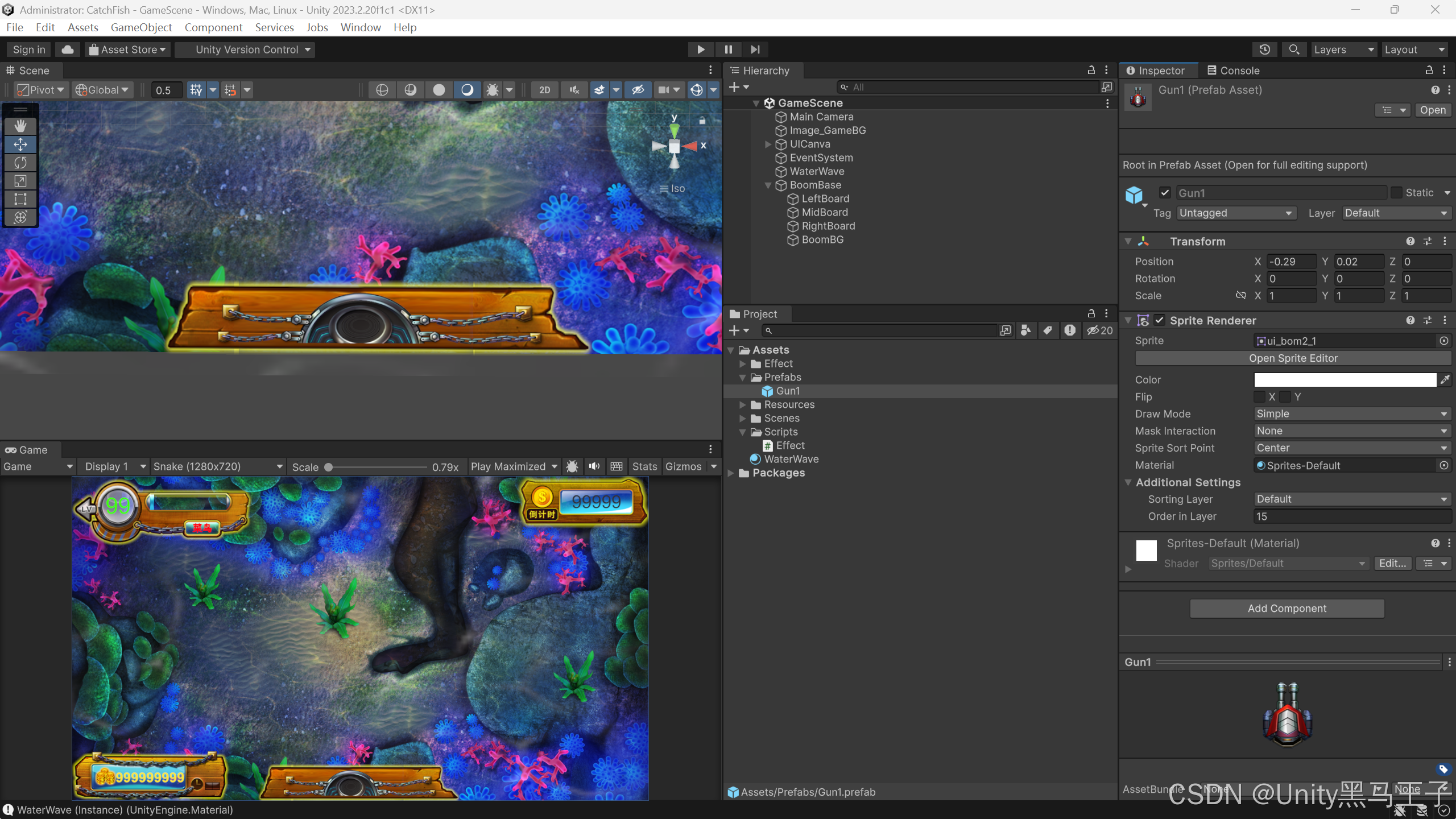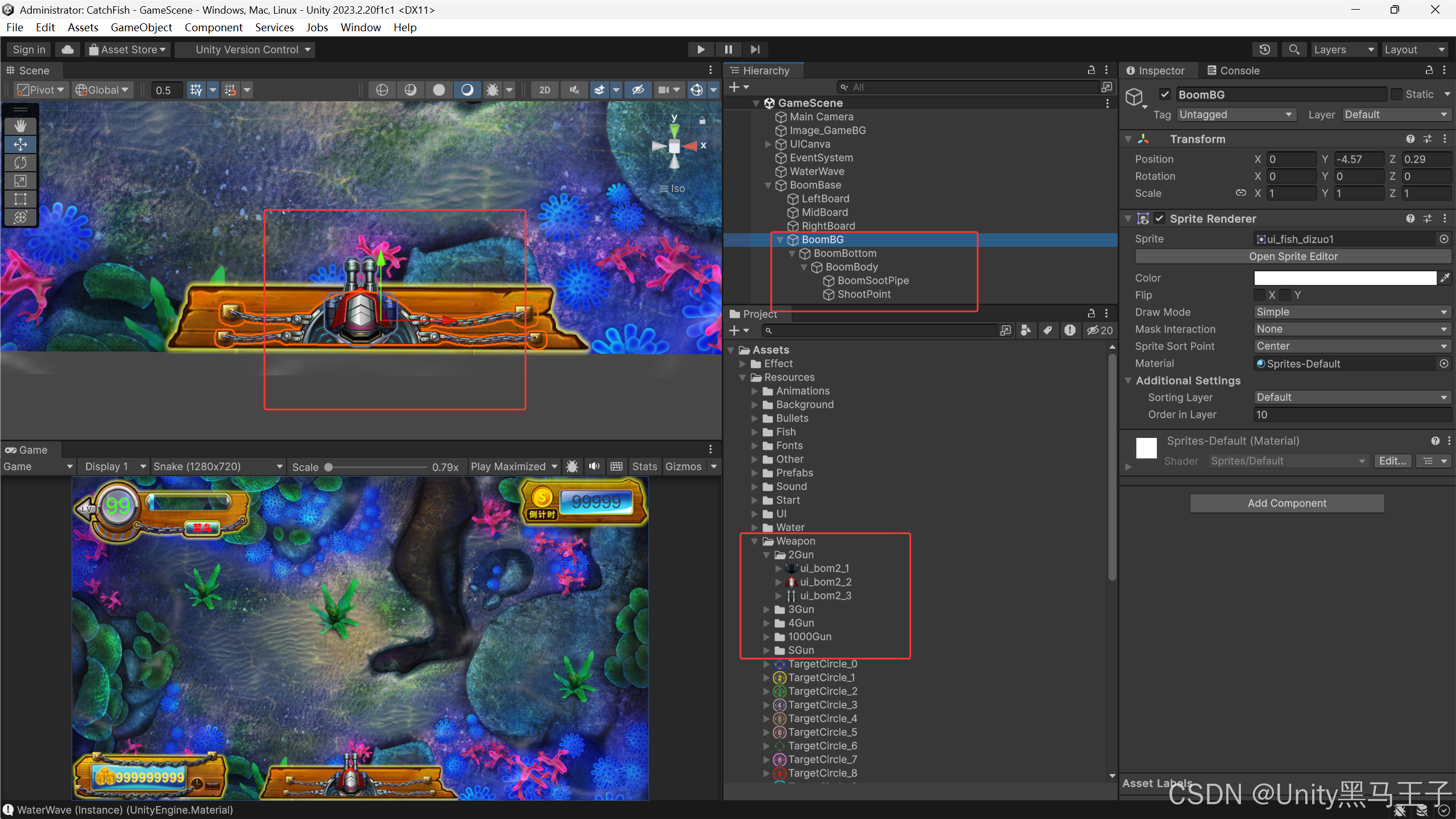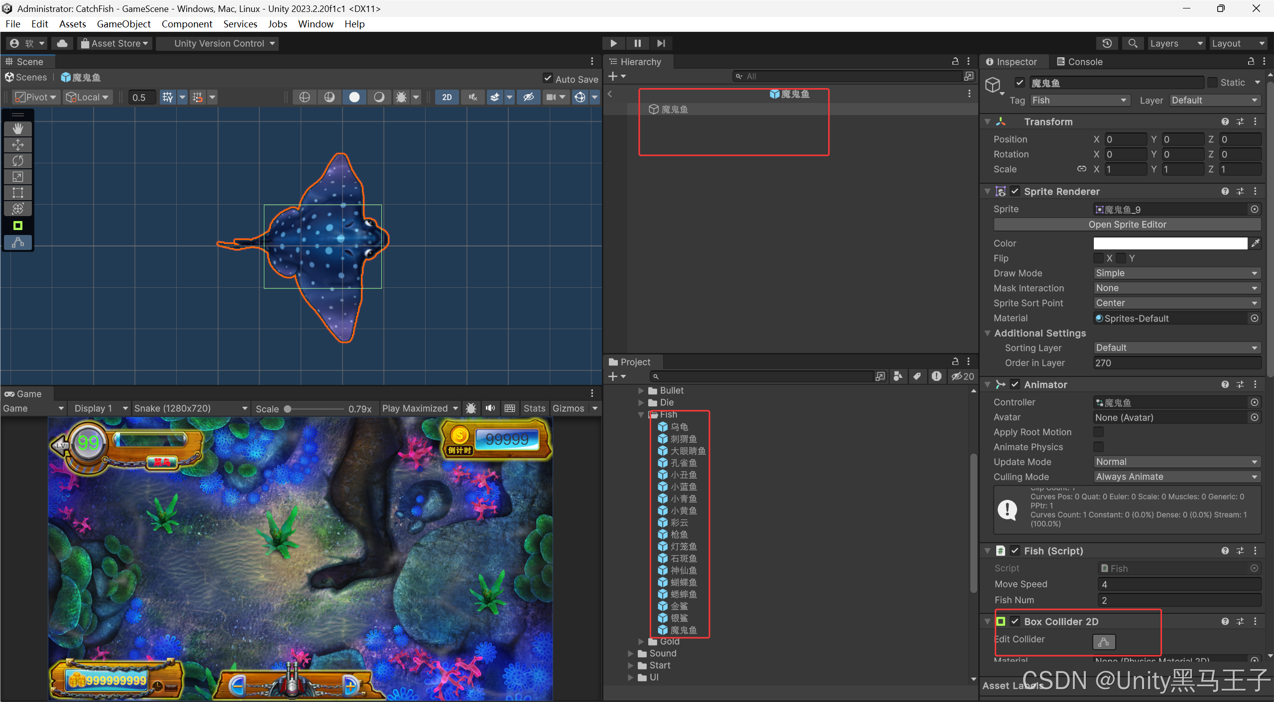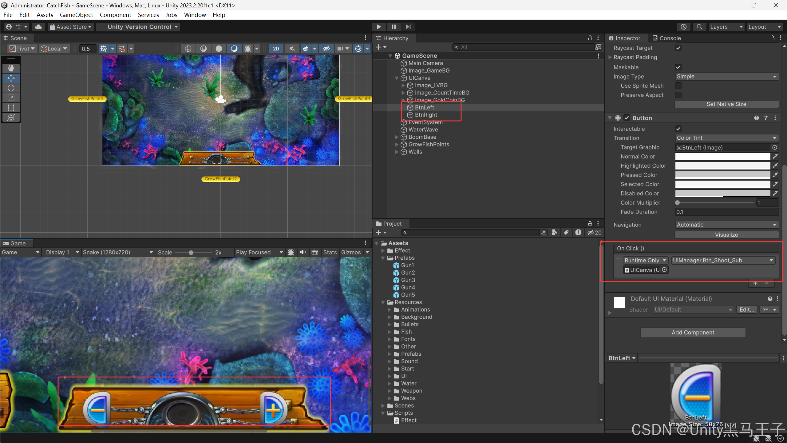 核心逻辑:金币通过捕获鱼增加(Fish脚本),发射子弹消耗(BulletShoot脚本),UI 实时显示当前金币数。