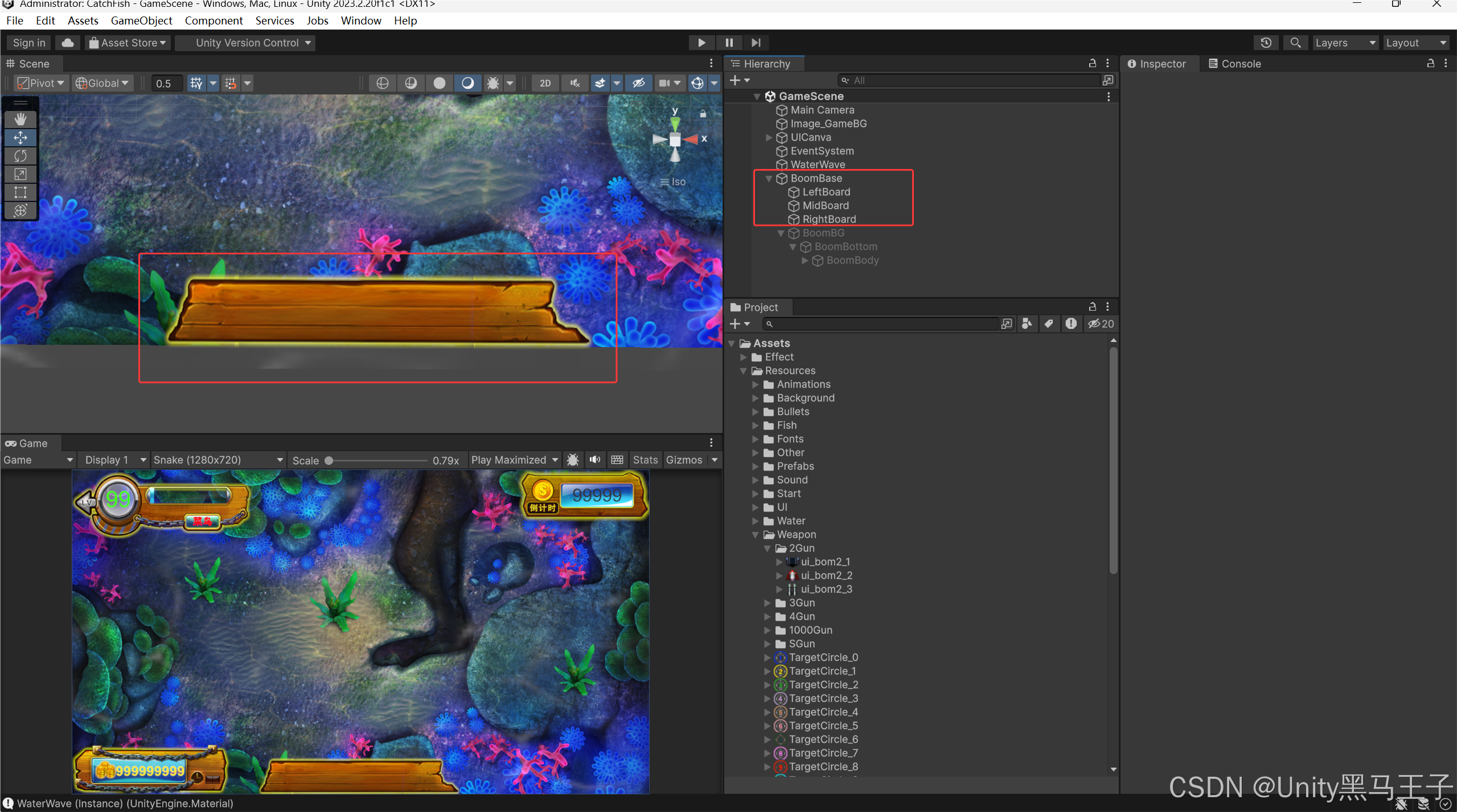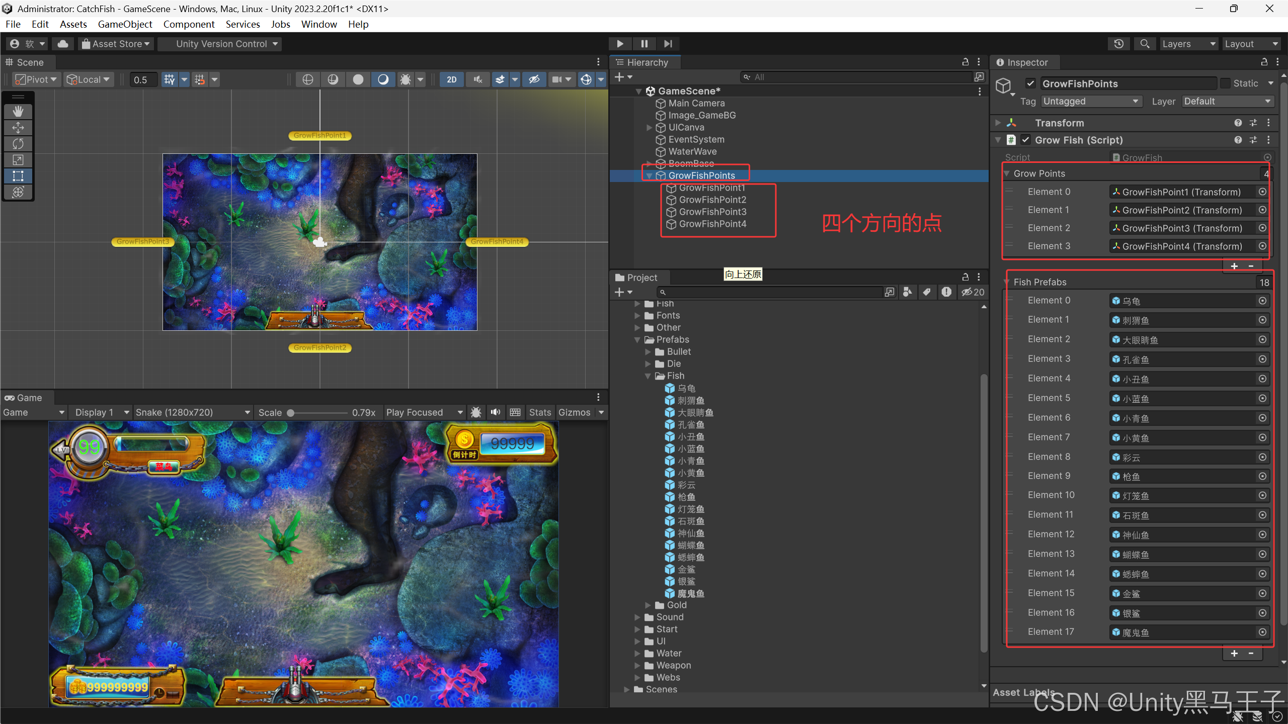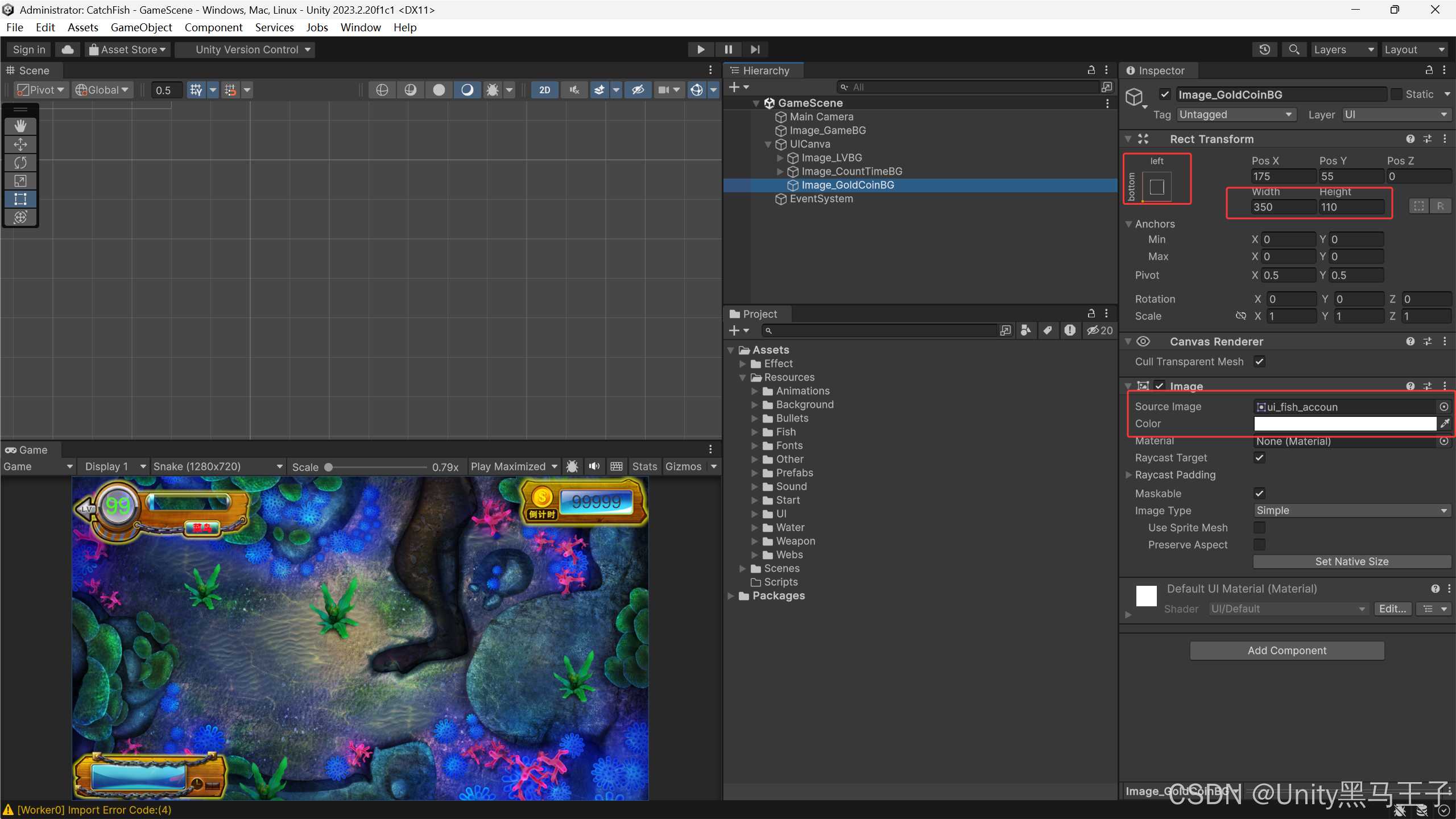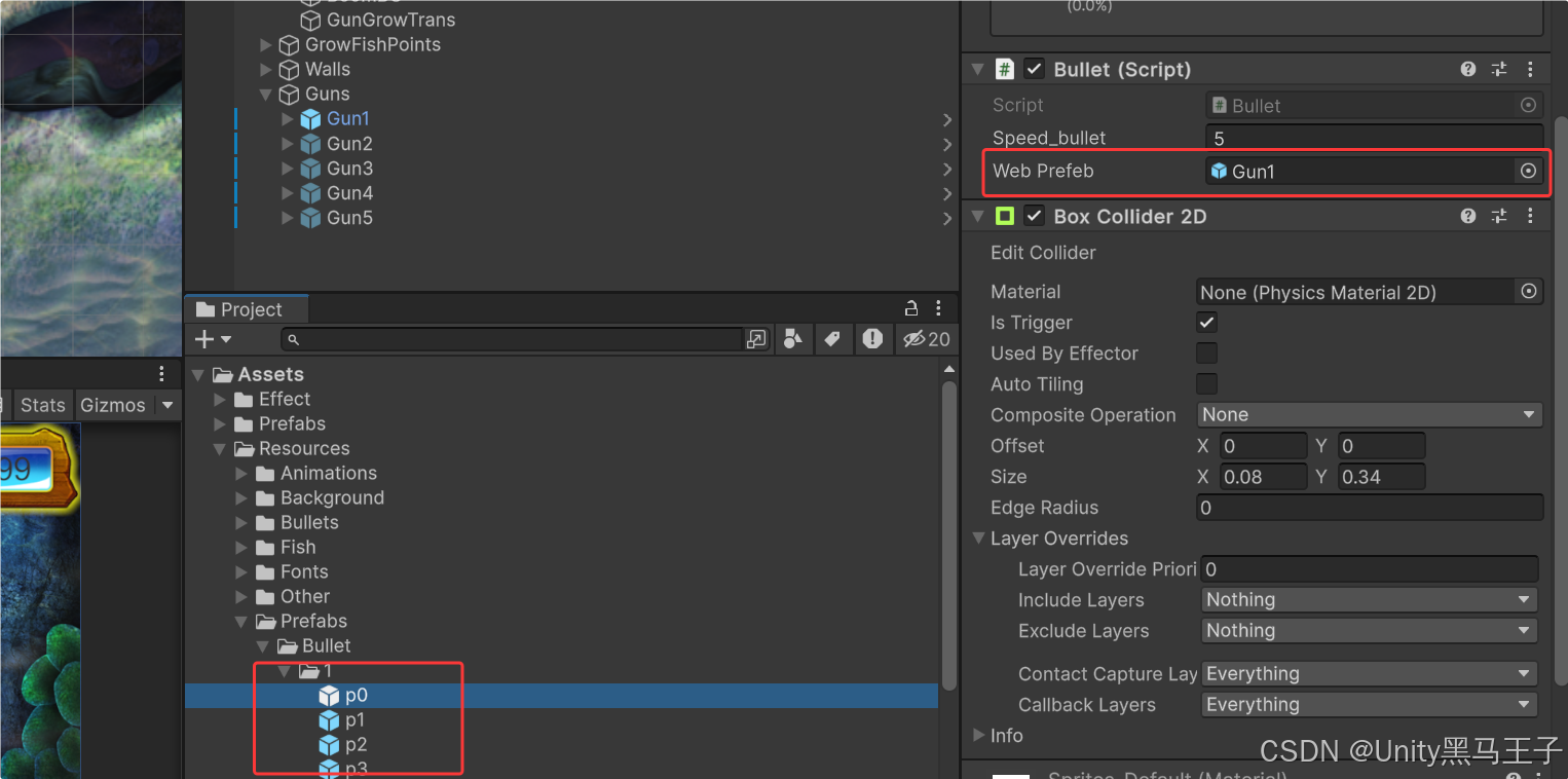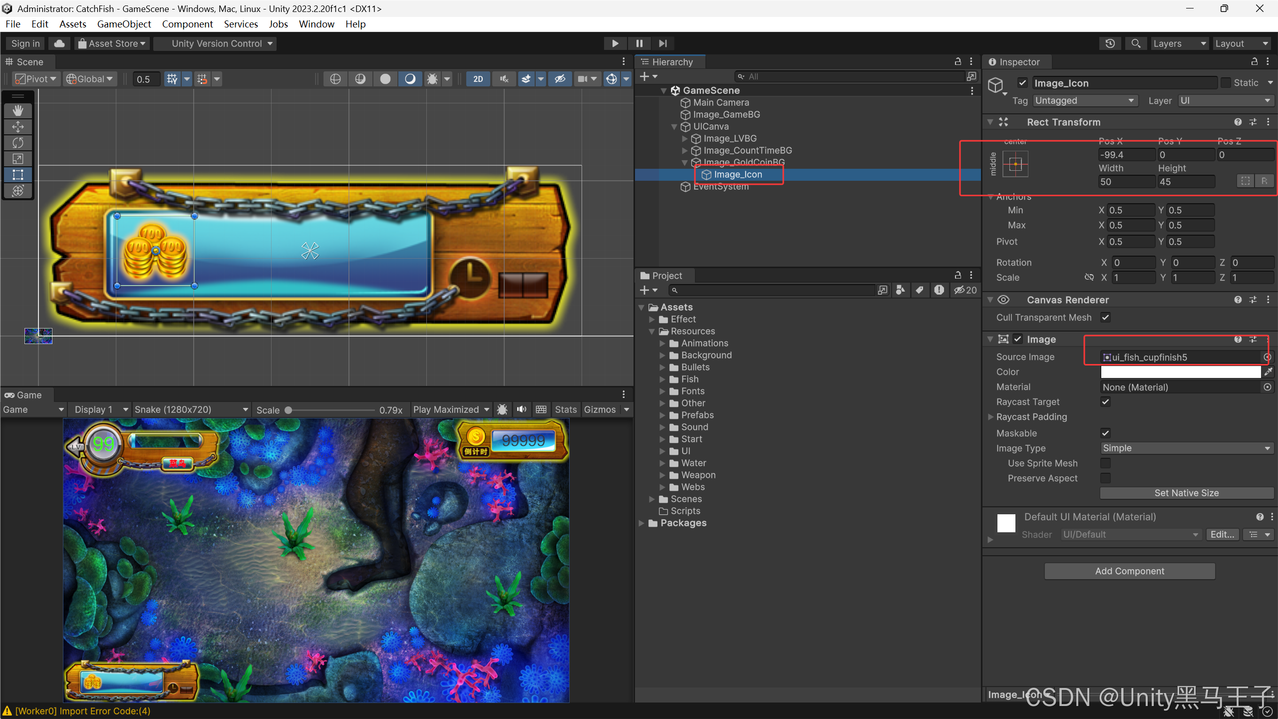 核心逻辑:金币通过捕获鱼增加(Fish脚本),发射子弹消耗(BulletShoot脚本),UI 实时显示当前金币数。