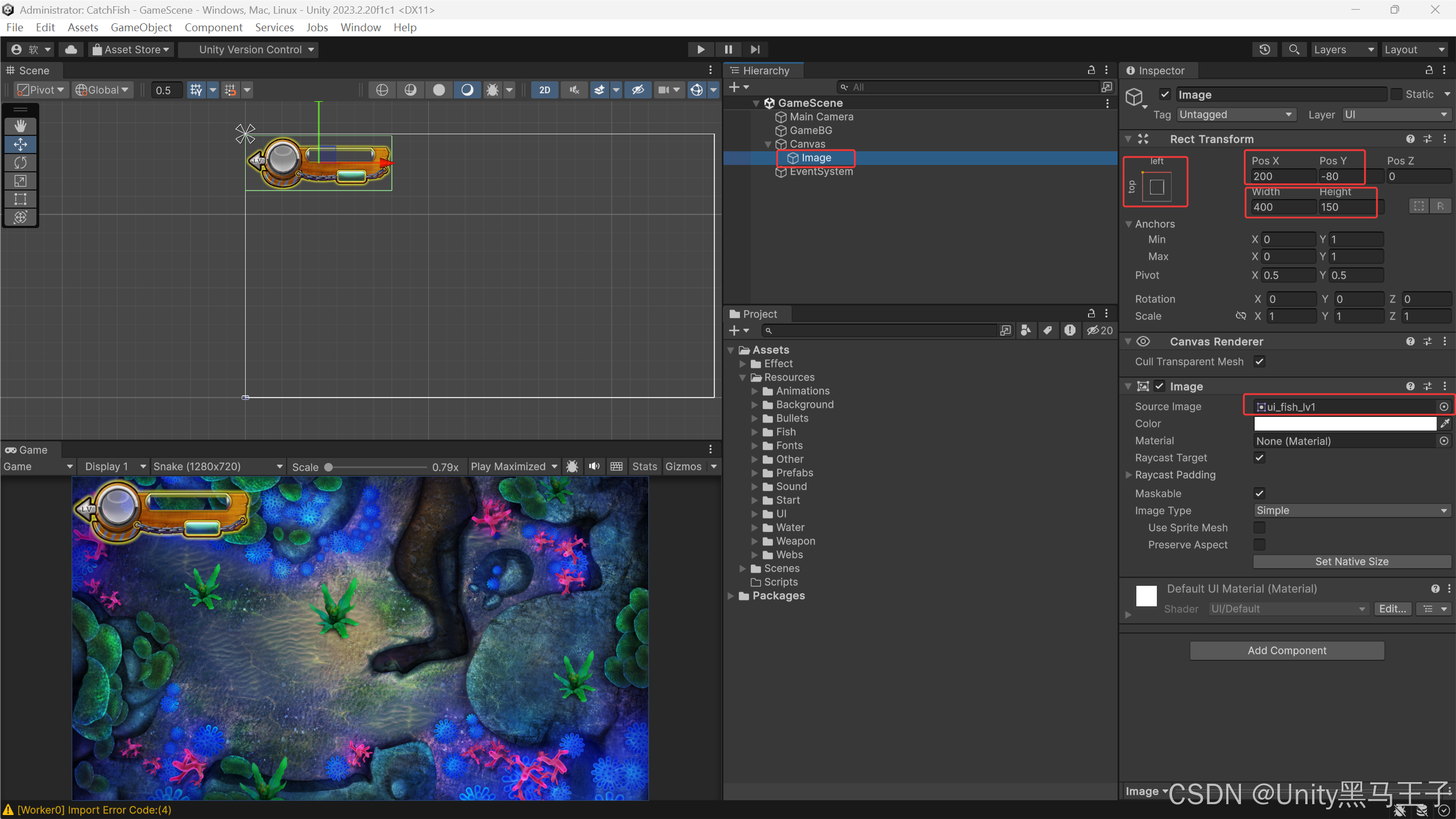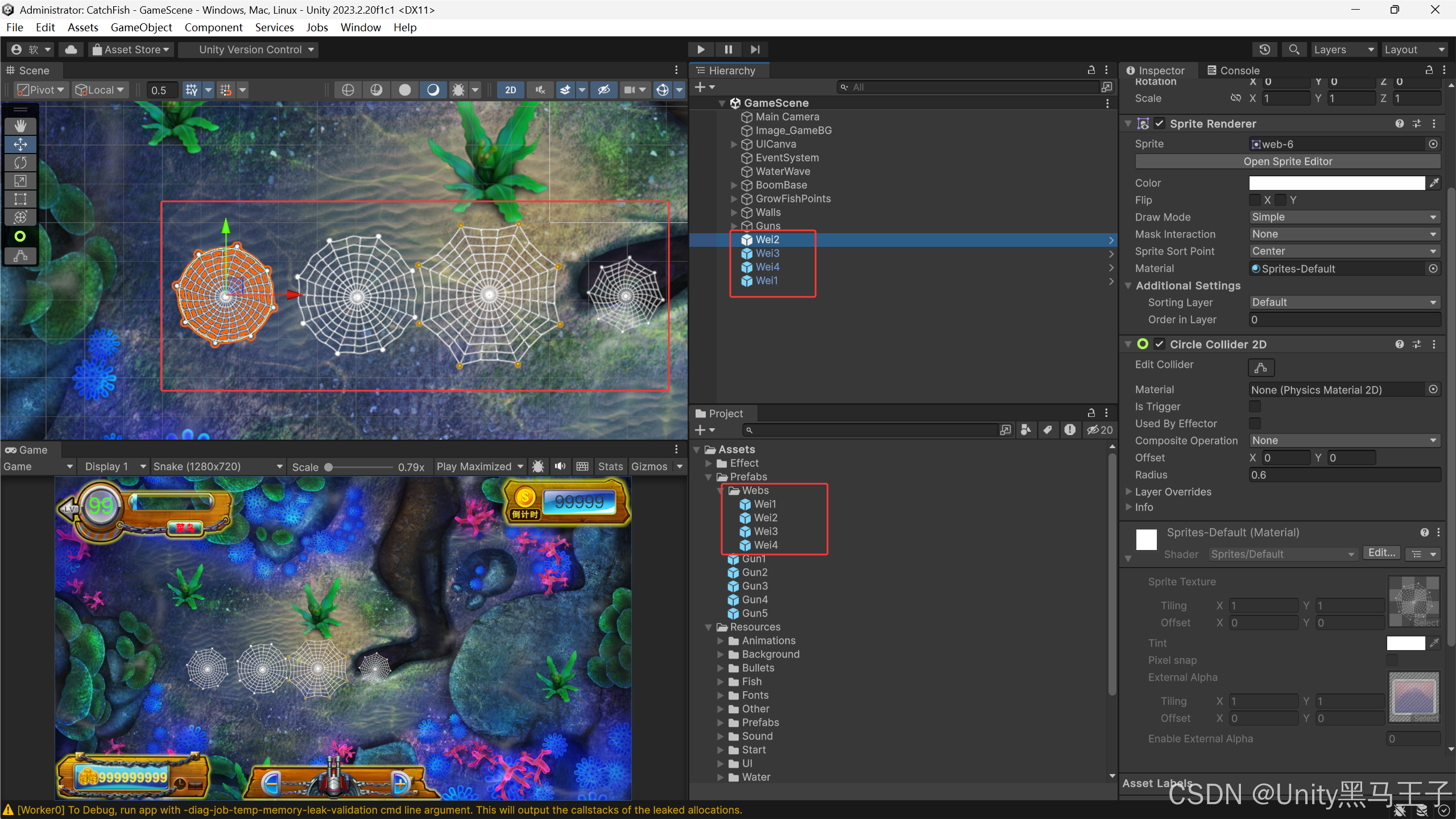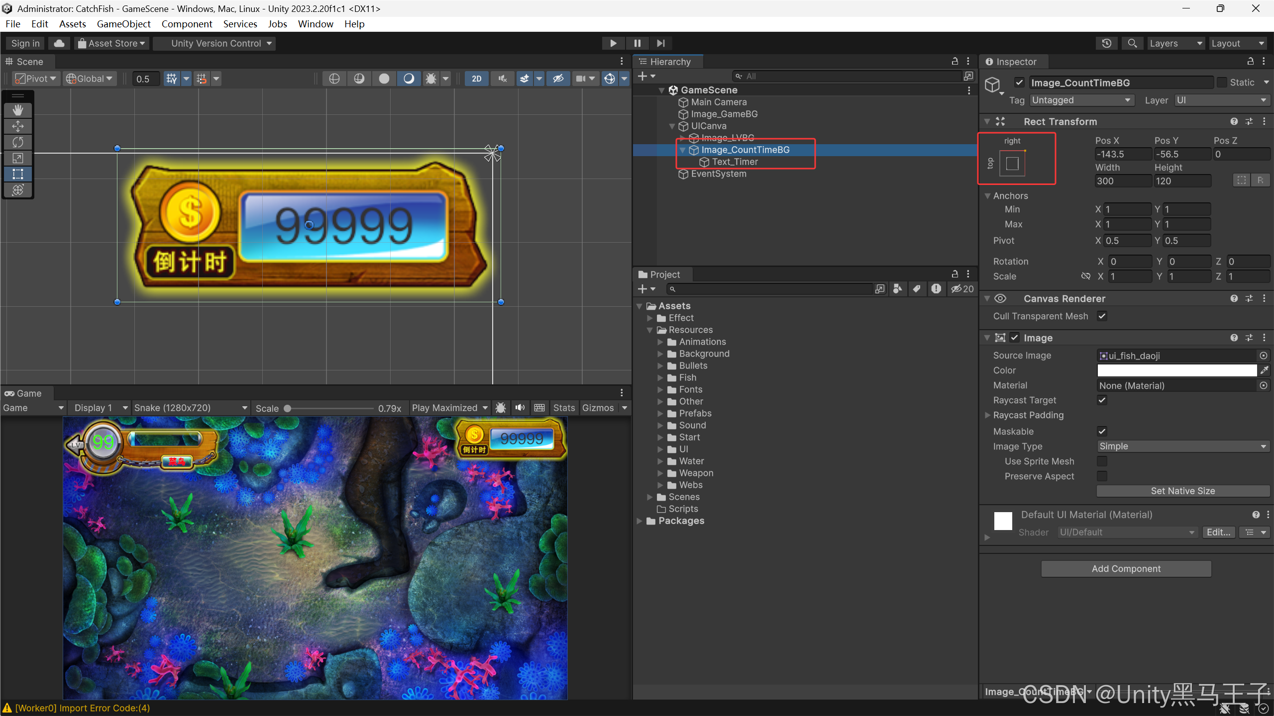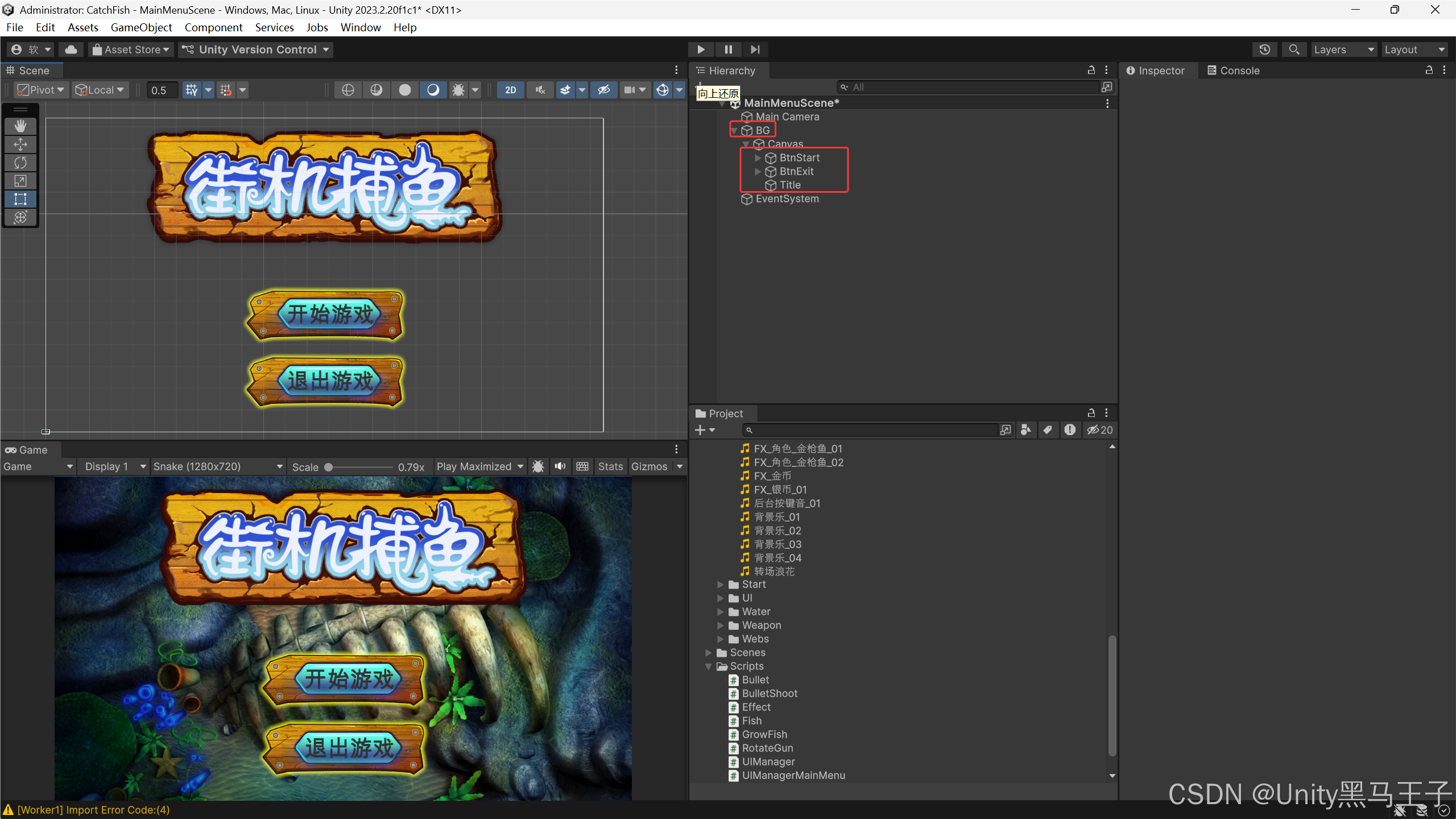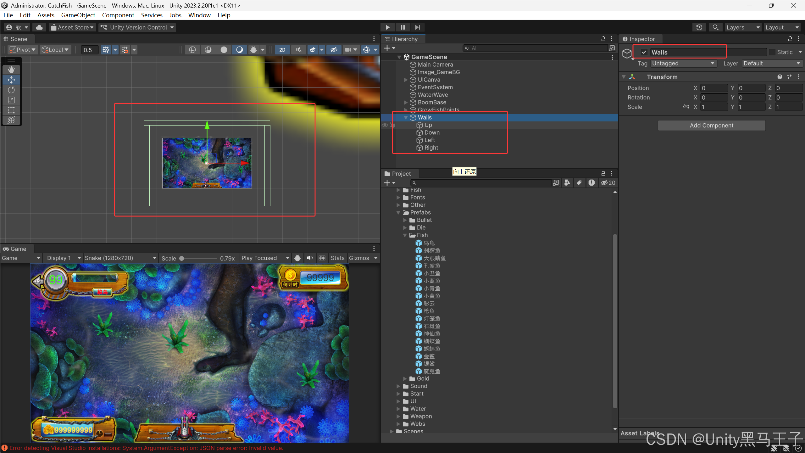 核心逻辑:金币通过捕获鱼增加(Fish脚本),发射子弹消耗(BulletShoot脚本),UI 实时显示当前金币数。