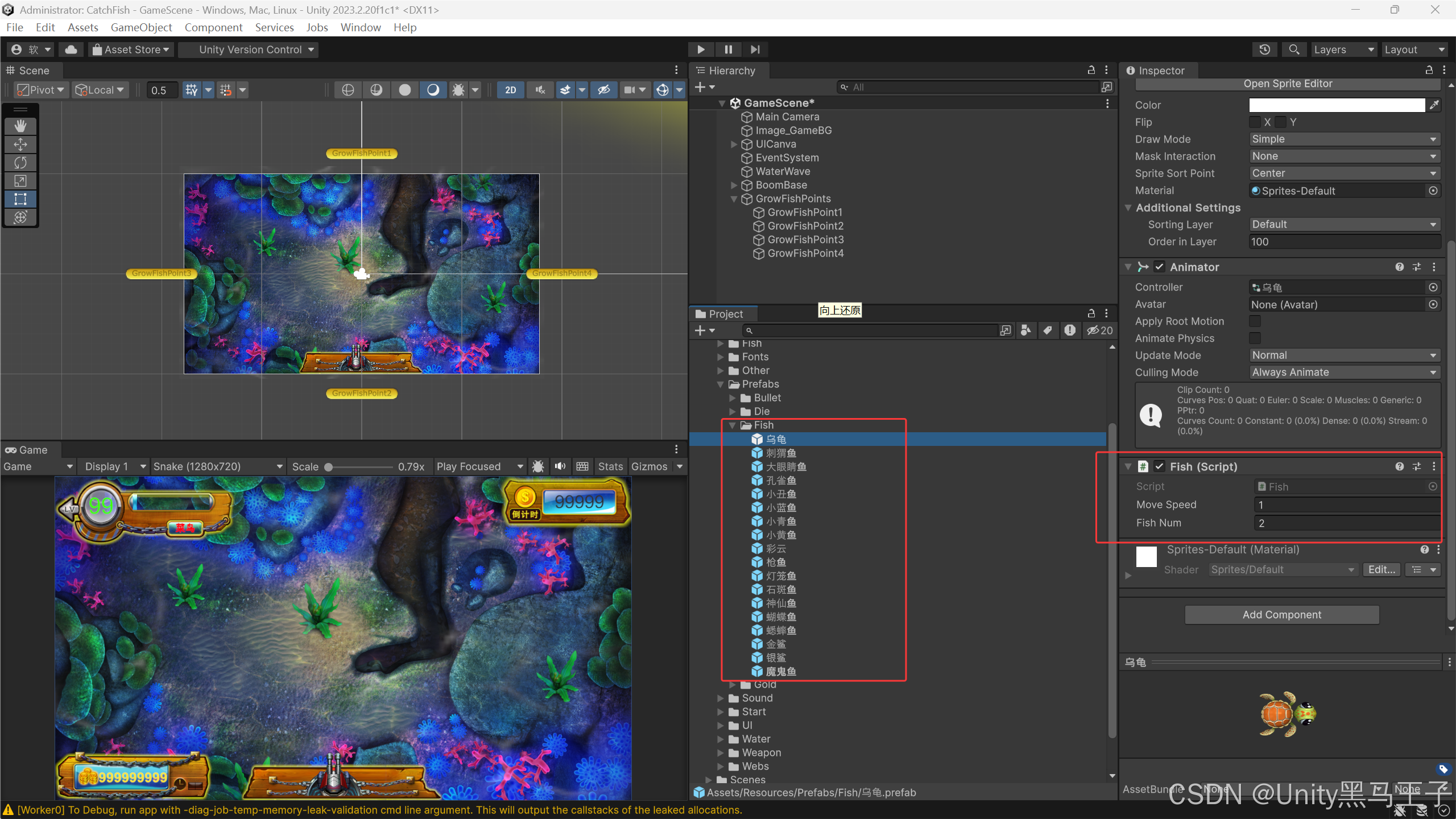moveSpeed控制移动快慢,fishNum定义该品种一次生成多少条鱼(由预制体本身决定,比如 “小丑鱼” 一次生成 5 条,“鲨鱼” 一次生成 2 条)。Update中通过Translate实现移动,Vector3.right是 “自身局部坐标系的右方向”,因此鱼的移动方向会受其旋转角度影响(这与生成时的旋转设置呼应)。