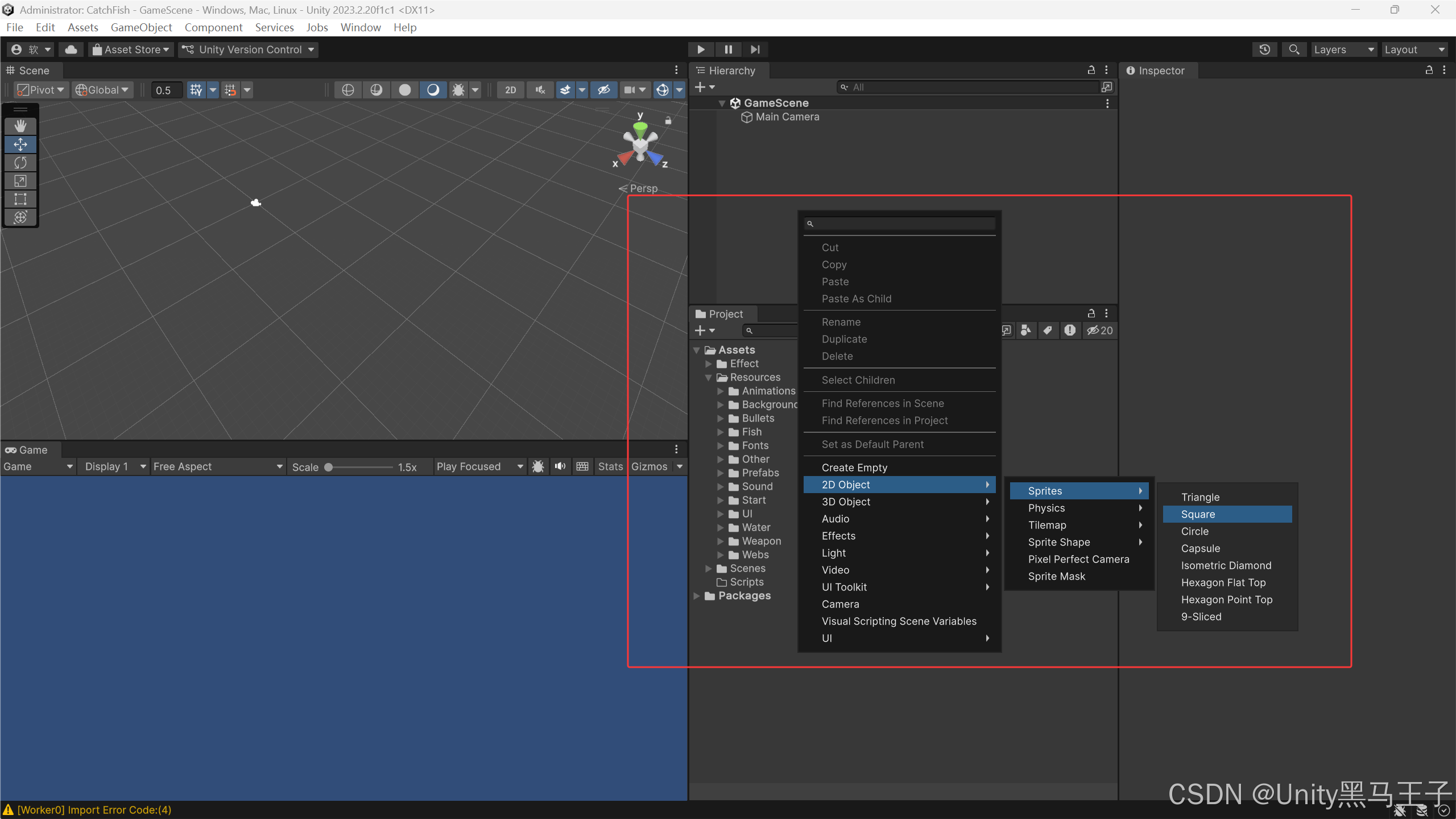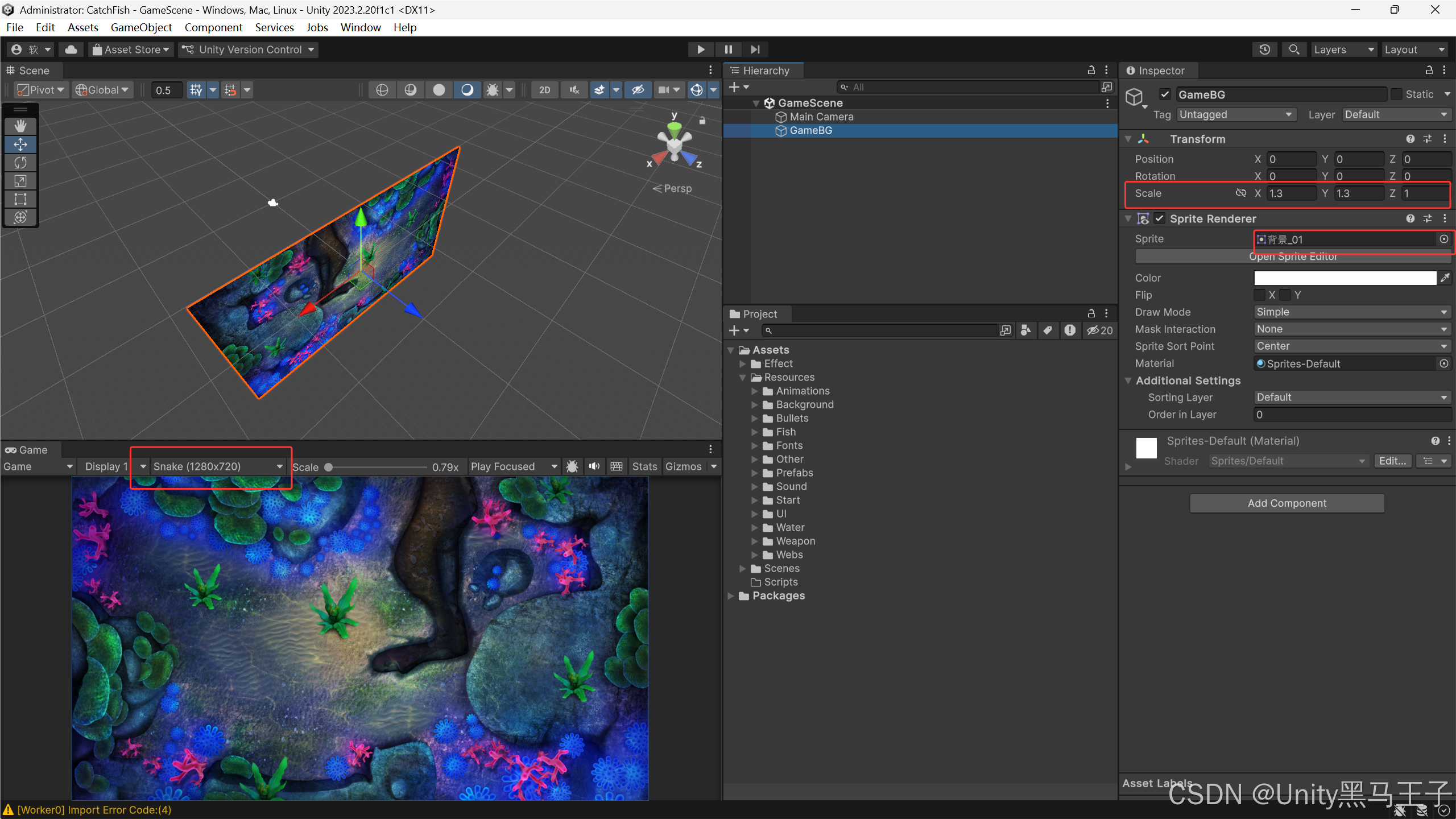 2.选中GameScene,创建背景2DSprite——Square,拖入背景素材,调整大小(1.3倍即可)。调整Game视图分辨率为1280*720
