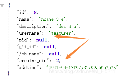 使用api请求数据如下所示,箭头指向的数据 是User表中的用户id;也就是experiment.creator_uid--->user.id