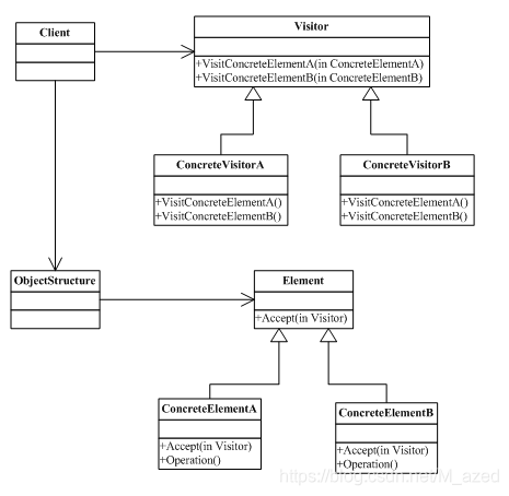 - 对象结构角色(Object Structure):这是使用访问者模式必备的角色。它要具备一下特征:能枚举它的元素;可以提供一个高层的接口以允许该访问者访问它的元素;可以是一个复合(组合)或是一个集合,如一个列表或一个无序集合。
