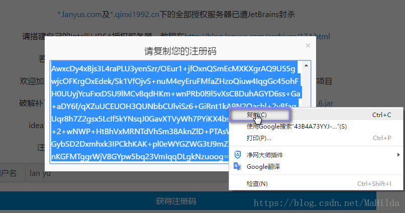 在IntelliJ IDEA 注册码网站,获取激活码,以前允许自定义用户名,现在已经是No了,只能直接获取激活码。