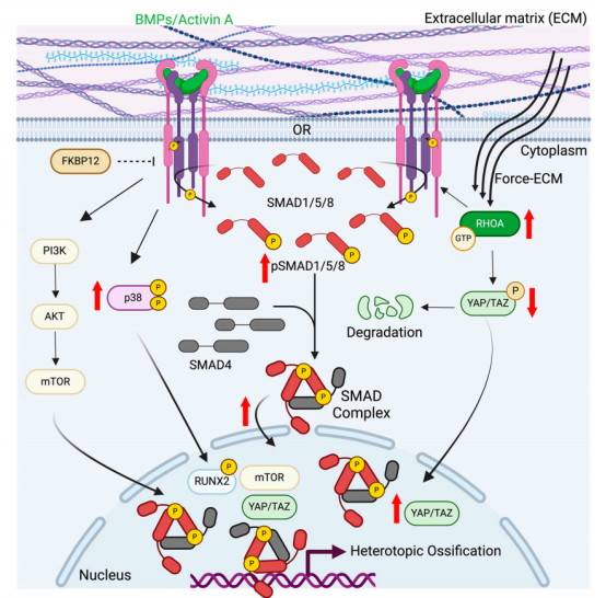ACVR1通过MAPK(p38/ERK/JNK)、PI3K/AKT/mTOR和RhoA通路传递信号,激活RUNX2等转录因子并调控细胞骨架。这些通路与机械传导交叉对话,突变后协同放大成骨信号,尤其RhoA-YAP/TAZ轴误判微环境硬度促进病理性分化。
