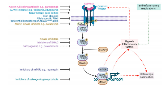 靶向ACVR1的治疗策略主要针对其突变导致的信号通路异常激活(如FOP、弥漫性脑桥胶质瘤/DIPG等疾病)。激活素A阻断抗体,例如garetosmab,抑制激活素A介导的信号传导。ACVR1 抑制剂,包括fidrisertib和zilurgisertib,抑制突变ACVR1受体的活性。