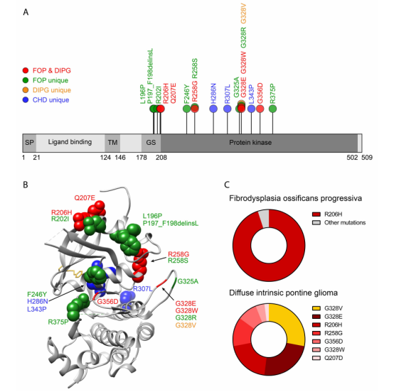 激活素受体1型(ACVR1)也称为ALK2,是骨形态发生蛋白(BMP)I型受体,参与多种生物过程,包括骨骼、心脏、软骨、神经和生殖系统的发育和调节。其功能获得性突变(如R206H)导致进行性骨化纤维发育不良(FOP)。