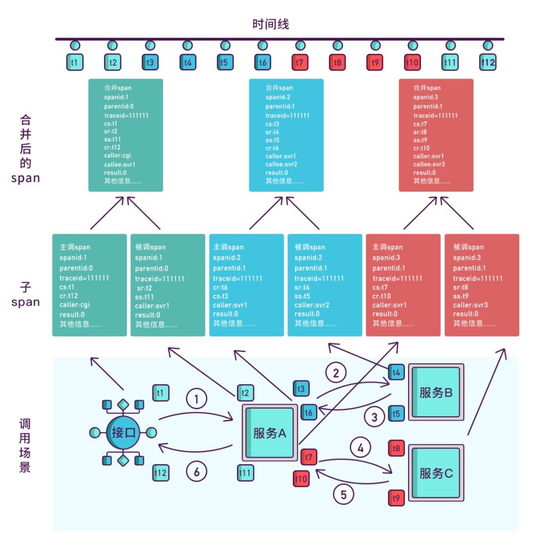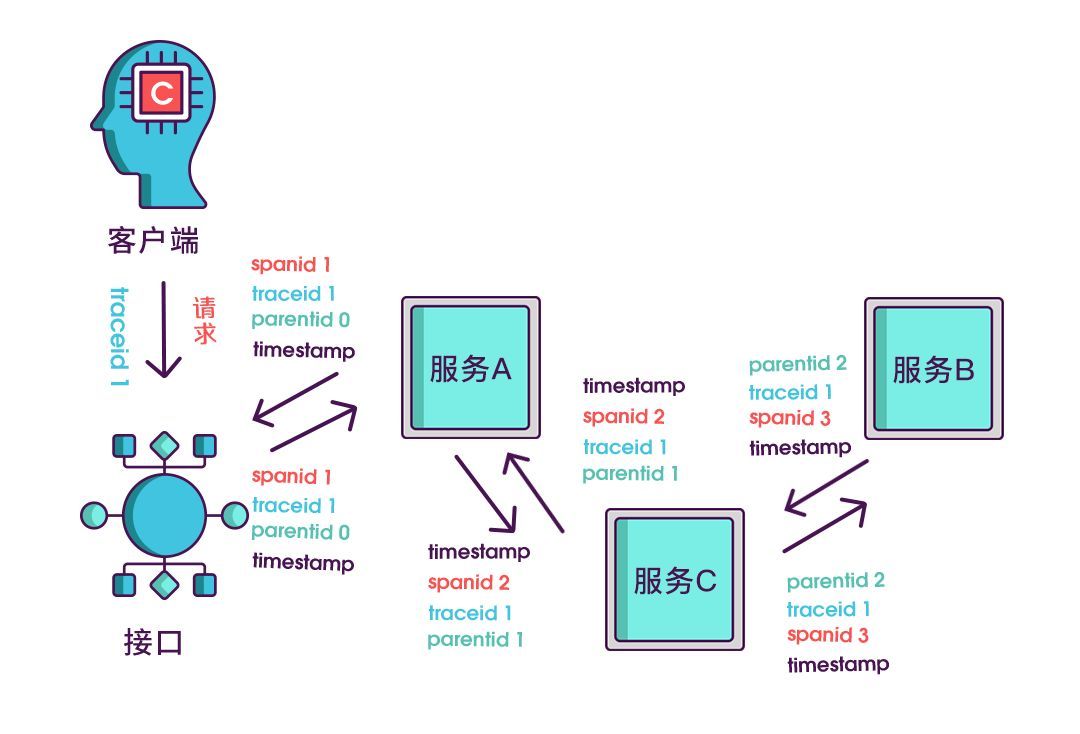 timestamp,把请求发出、接收、处理的时间都记录下来,计算业务处理耗时和网络耗时,然后用可视化界面展示出来每个调用链路,性能,故障
