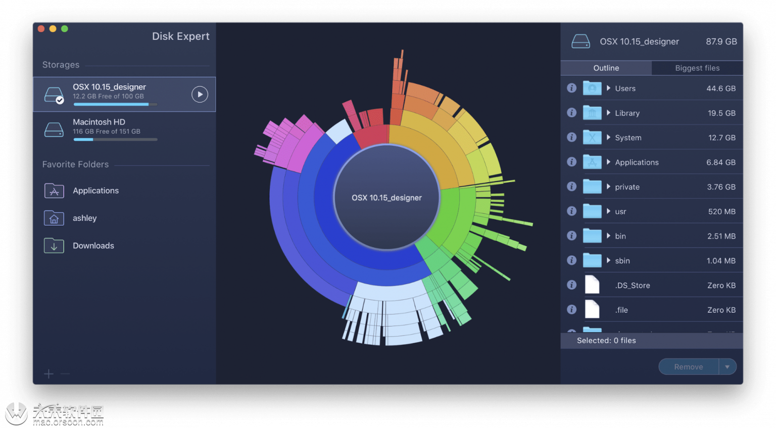 要深入研究,您可以使用出色的Disk Expert,它根据每个人使用的存储量,以彩色圆形图创新地显示驱动器上的文件和文件夹,并以不同大小的部分显示。单击任何单独的部分都会将其展开以显示下一级别的文件,从而使您可以轻松理解数据的直观表示形式。