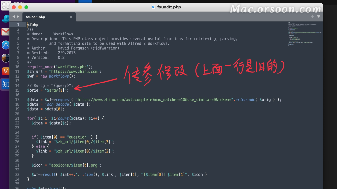 修改原来的传递参数,注释掉的是旧的。因为原来整个php脚本是在alfred里运行,现在改成独立脚本后,需要从命令行参数1里获取了。