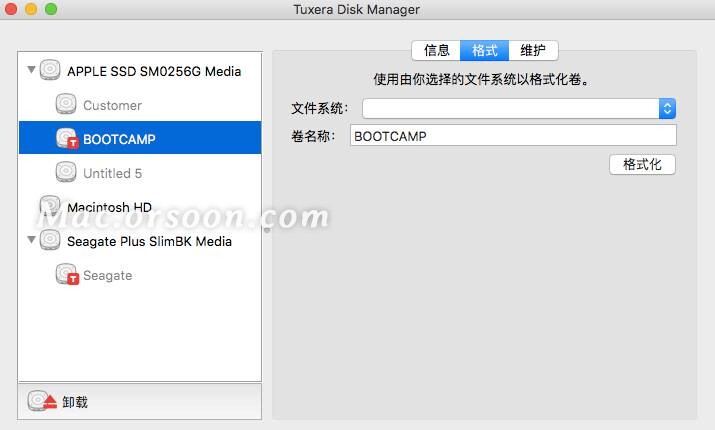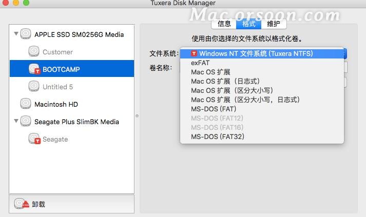 Tuxera NTFS for Mac提供NTFS、exFAT、Mac OS、FAT32等文件系统选择,我们可根据数据存储、软件安装的需要,选择合适的格式。
