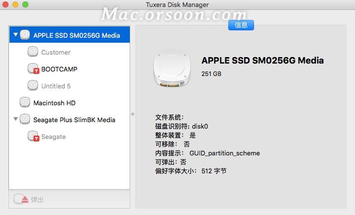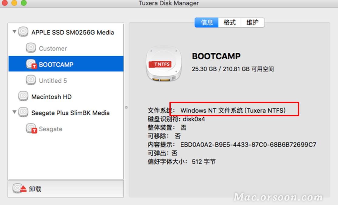 在本例的苹果设备中,包含了NTFS格式与Mac OS格式的硬盘。