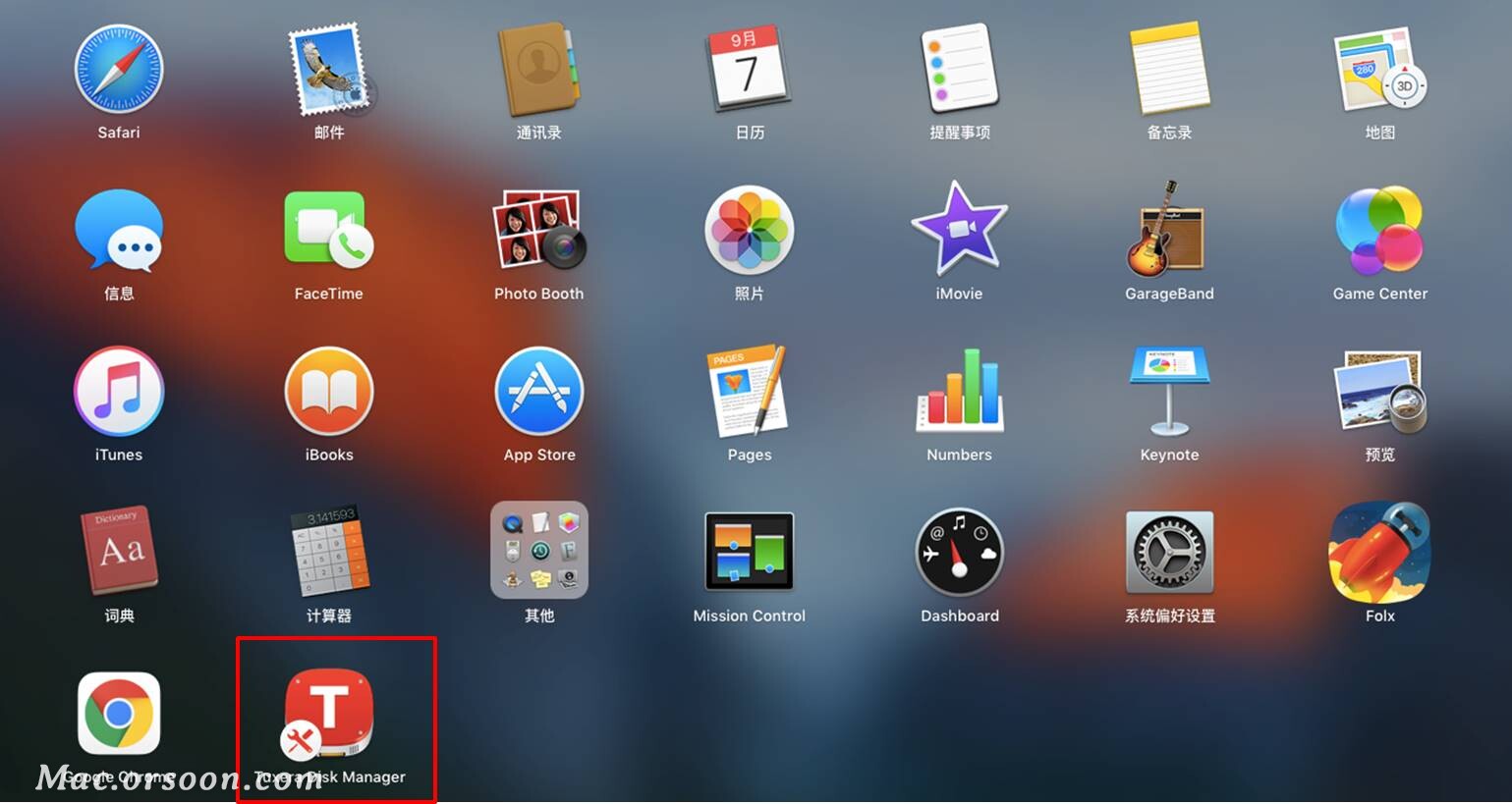 首先,打开苹果的启动台(即Lauchpad),如图1所示,找到并双击Tuxera Disk Manager,该工具是Tuxera NTFS for Mac的磁盘管理界面,也是软件的主界面。