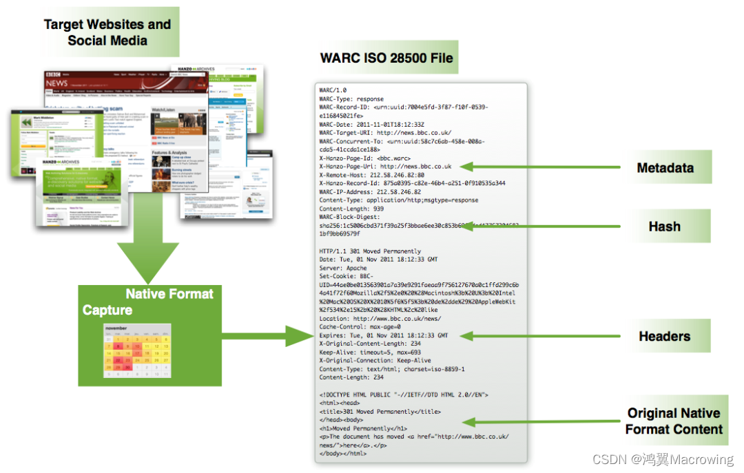 这些信息记录了网络资源在被采集和保存时所处的网络环境的情况,主要包括WARC记录中的“request”和“response”类型。