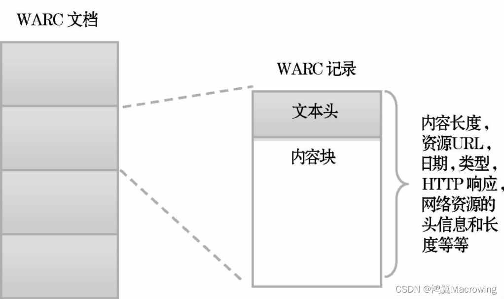 根据GB/T 33994-2017中的描述,WARC文件格式提供了一个由多个资源记录(数据对象)连接成的一个长文件的协议,其中每个资源记录由一组简单文本头和任意数据内容块构成。文本头信息保存了本WARC记录的管理信息,内容块保存了本WARC记录中的网络资源的内容。