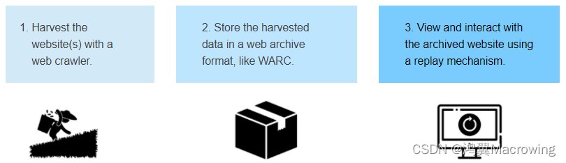 采用WARC格式归档和利用网络资源非常方便,基本的步骤就三步:收割(采集/摄入)、打包(存储)、浏览(访问)。