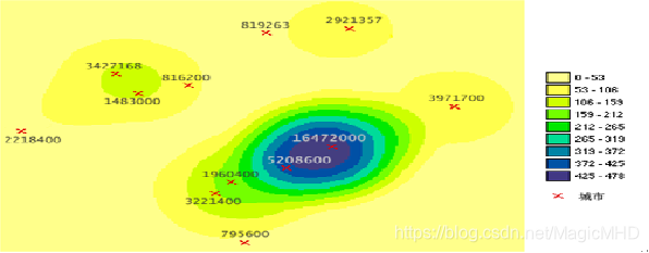 密度分析是指根据输入的要素数据集计算整个区域的数据集状况,从而产生一个连续的密度表面。通过计算密度,将每个采样点的值散布到整个研究区域,并获得输出栅格中每个像元的密度值。下图为人口分布的密度表面图。
