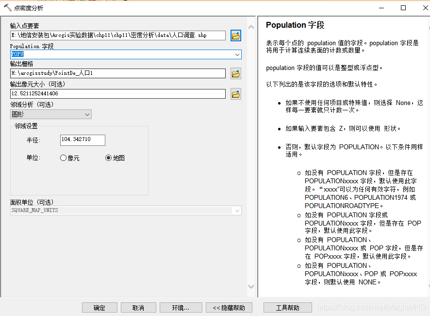 点密度分析用于计算每个输出栅格像元周围点要素密度。从理论上讲,每个栅格像元中心的周围都定义了一个邻域,将落入邻域内的样本点的Population字段值相加,然后除以邻域面积,即得到点要素的密度。