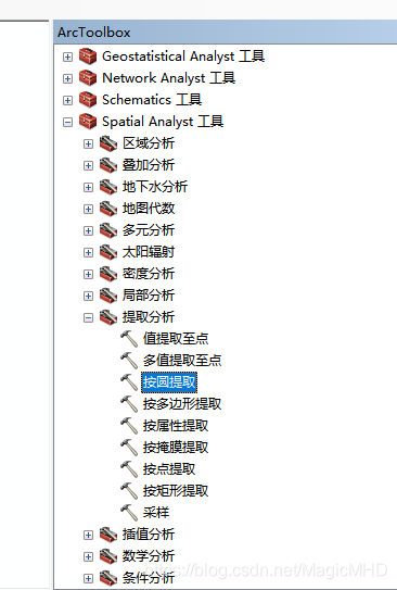这里我们选择空间分析工具中提取分析工具里面的按圆提取功能如下图: