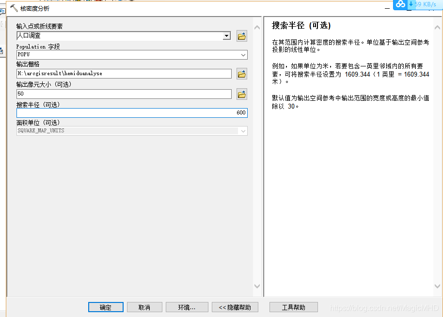 线密度分析用于计算每个输出栅格像元邻域内的线状要素的密度,密度的计量单位为“长度单位/面积单位”。理论上,使用以各个栅格像元中心为圆心以搜索半径绘制一个圆,每条线上落入该圆内的部分长度与POPU字段值相乘,对这些数值进行求和,然后将求得的总和除以圆面积就得到该栅格单元的的密度。线密度分析操作如下: