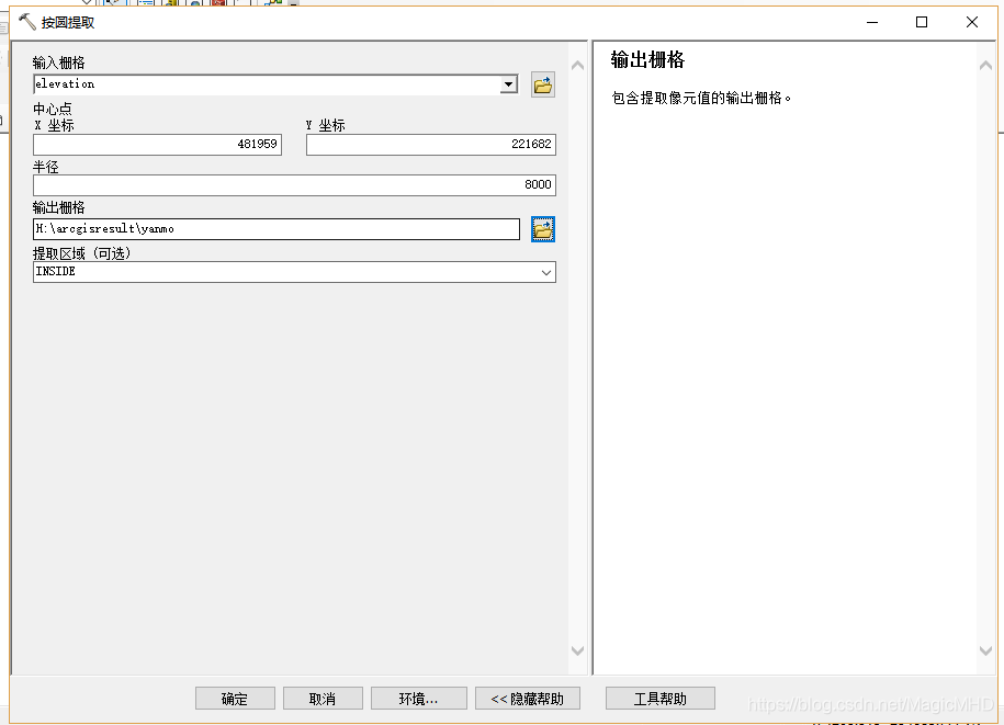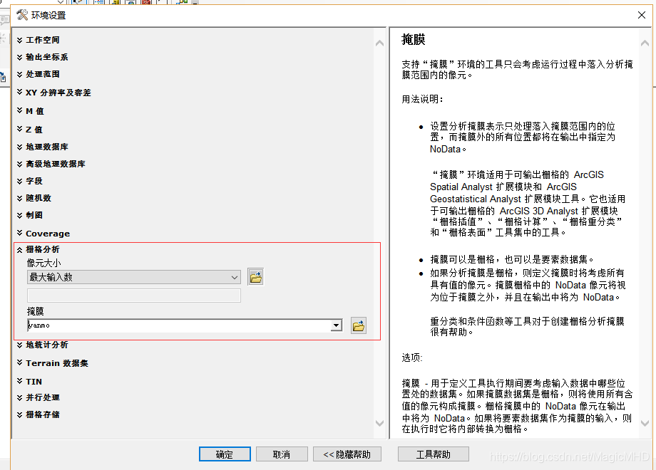 打开地理处理--》环境,选择栅格分析,然后输入我们上面创建的掩膜分析即可。