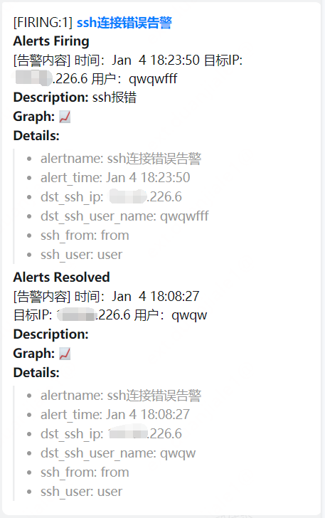 此告警示例为,监控 /var/log/secure 里关于ssh登陆失败的日志,监控日志为:Jan 3 18:26:06 testqwe sshd[22177]: Invalid user rmzx from 192.168.13.168 port 33640 ,告警内容为截取日志中的时间、user名称和目标IP地址
