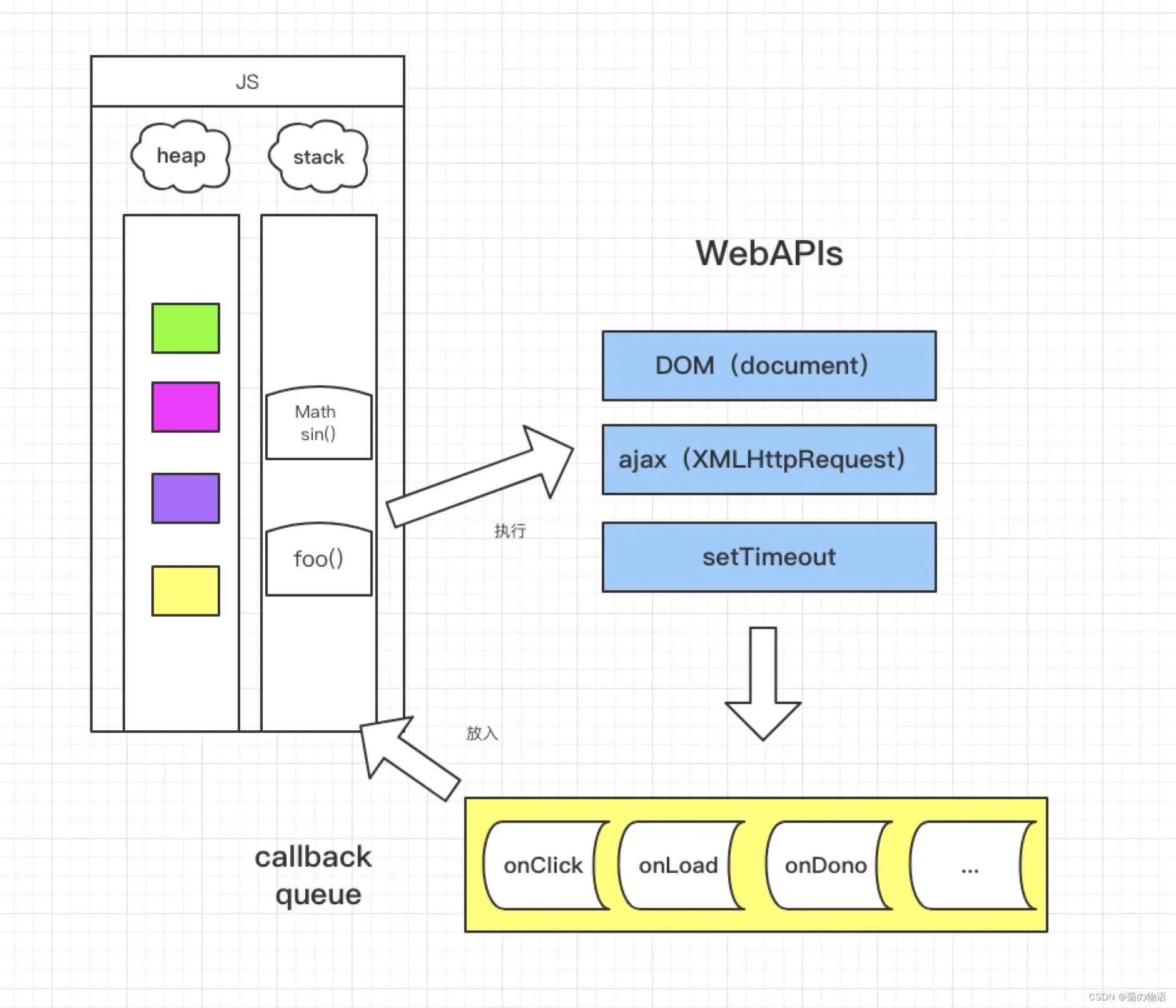 js执行代码的过程是自上而下,遇到同步任务直接把同步任务压入执行栈执行代码,遇到异步任务会把异步任务的回调放入任务队列中。等到所有同步任务执行完毕,web api回去任务队列中查找是否有任务需要执行,如果有则依次压入执行栈中执行异步任务的回调。需要注意的一点是,微任务的优先级要大于宏任务,也就是如果任务队列中有微任务,则微任务先执行。